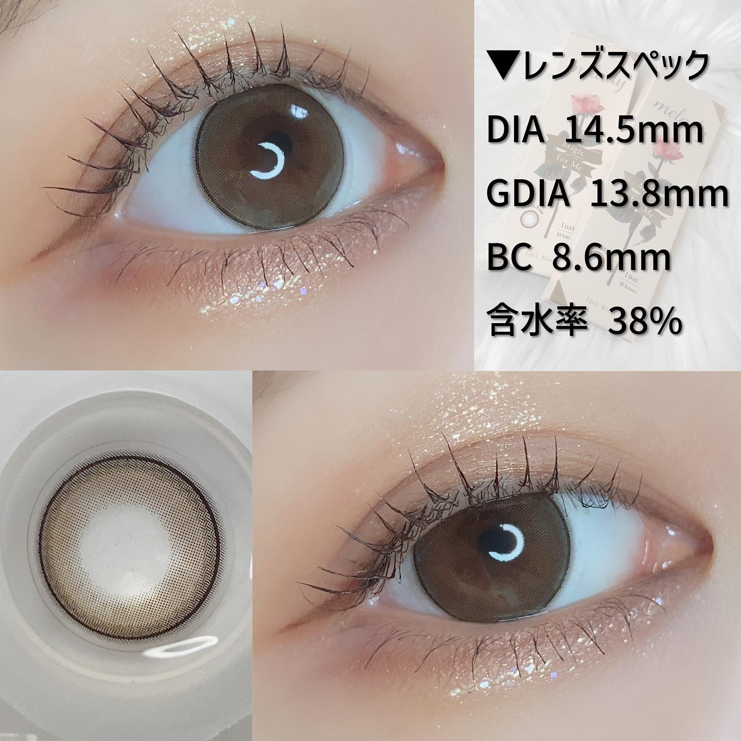 \既存色3色がマンスリーになって登場🎀/.melady¥1400(税抜)/2枚.DIA14.5mm着色直径13.8mmBC8.6mm含水率38%着画:マンスリーレンズ▪️アイドルリング細フチ×ちゅるんブラウン少しくすみも感じるようなナチュラル...
