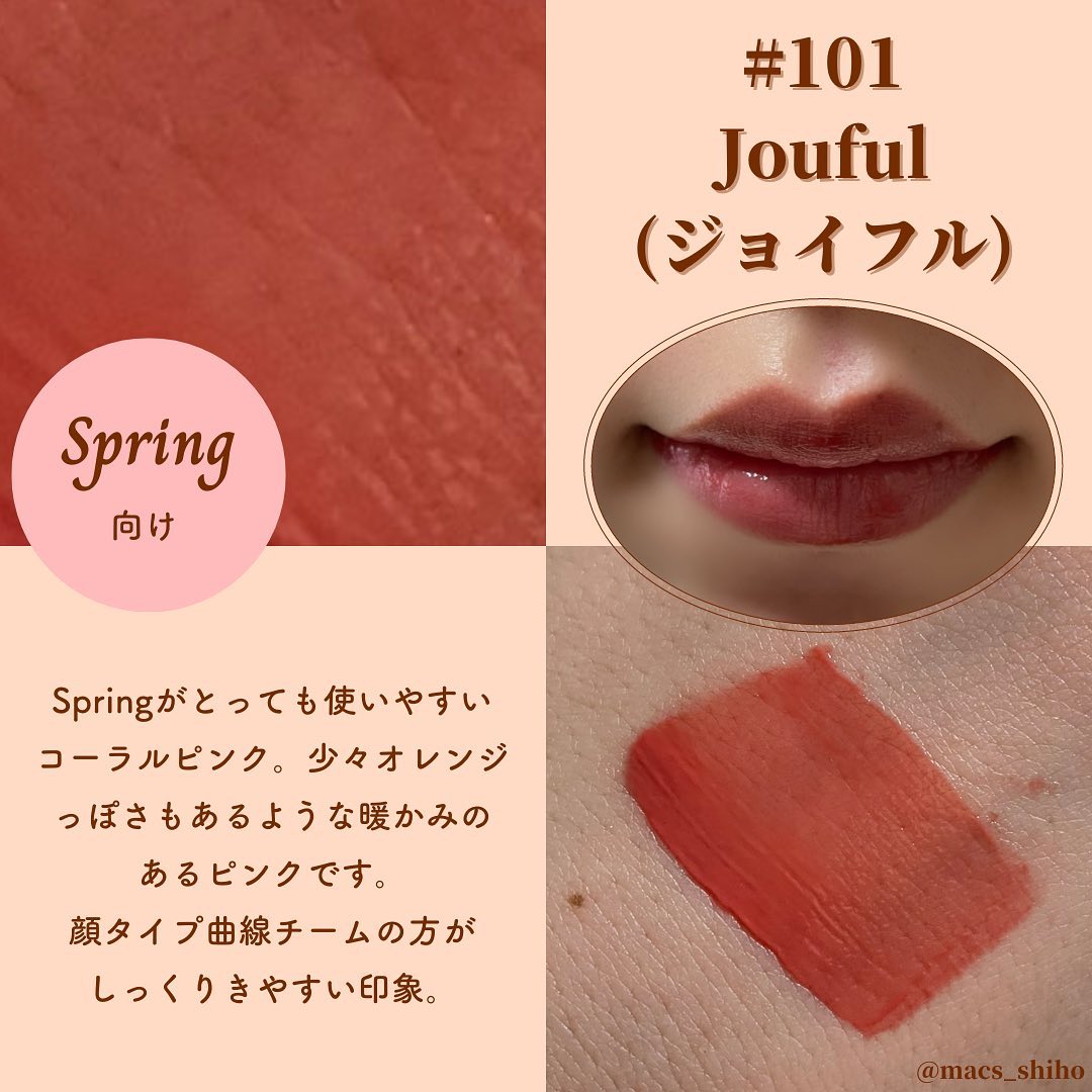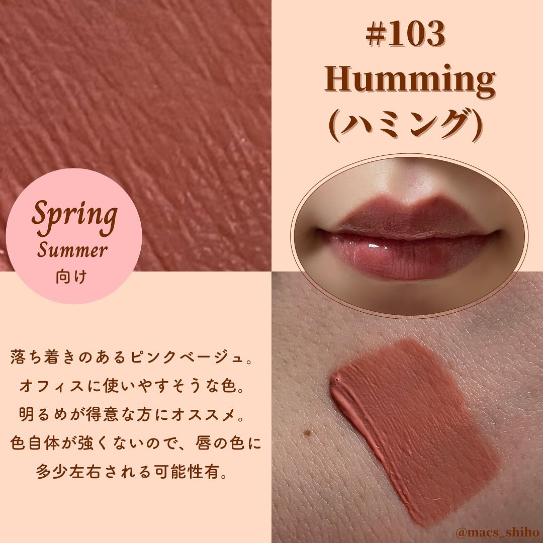 - <101 ジョイフル> 水、リンゴ酸ジイソステアリル、ダイマージリノール酸(フィトステリル/イソステアリル/セチル/ステアリル/ベヘニル)、ジイソステアリン酸ダイマージリノレイル、ノナイソステアリン酸ポリグリセリル-10、オクチルドデカノール、ビスジグリセリルポリアシルアジペート-2、水添ポリイソブテン、セチルPEG/PPG-10/1ジメチコン、ポリソルベート60(小麦由来)、イソステアリン酸ソルビタン(小麦由来)、1,2-ヘキサンジオール、グリセリン、ベヘニルアルコール、(アクリル酸/MA)コポリマーNa、ペンチレングリコール、BG、ポリアクリレート-13、トロメタミン、(アクリレーツ/アクリル酸アルキ ル(C10-30 )クロスポリマー、エチルヘキシルグリセリン、ポリイソブテン、(アクリル酸ヒドロキシエチル/アクリロイルジメチルタウリンNa)コポリマー、スクワラン、デヒドロ酢酸、ステビオシド、香料、フィチン酸、カプリリルグリコール、ジメチコン、水添ロジン酸メチル、水酸化Al、ポリソルベート20(小麦由来)、トコフェロール、ライム果汁、キイチゴ果汁、レモン果汁、マンゴー果汁、フラガリアチロエンシス果汁、アンズ果汁、オレンジ果汁、グレープフルーツ液汁、キウイ果汁、パパイア果汁、[+/-]酸化チタン、黄4、黄5、赤 104(1)、赤227、青1 <102 デューイ> 水、リンゴ酸ジイソステアリル、ダイマージリノール酸(フィトステリル/イソステアリル/セチル/ステアリル/ベヘニル)、ジイソステアリン酸ダイマージリノレイル、ノナイソステアリン酸ポリグリセリル-10、オクチルドデカノール、ビスジグリセリルポリアシルアジペート-2、水添ポリイソブテン、セチルPEG/PPG-10/1ジメチコン、ポリソルベート60(小麦由来)、イソステアリン酸ソルビタン(小麦由来)、1,2-ヘキサンジオール、グリセリン、ベヘニルアルコール、(アクリル酸/MA)コポリマーNa、ペンチレングリコール、BG、ポリアクリレート-13、トロメタミン、(アクリレーツ/アクリル酸アルキル(C10-30))クロスポリマー、エチルヘキシルグリセリン、ポリイソブテン、(アクリル酸ヒドロキシエチル/アクリロイルジメチルタウリンNa)コポリマー、スクワラン、デヒドロ酢酸、ステビオシド、香料、フィチン酸、ジメチコン、水添ロジン酸メチル、水酸化Al、カプリリルグリコール、ポリソルベート20(小麦由来)、トコフェロール、ライム果汁、キイチゴ果汁、レモン果汁、マンゴー果汁、フラガリアチロエンシス果汁、アンズ果汁、オレンジ果汁、グレープフルーツ液汁、キウイ果汁、パパイア果汁、酸化チタン、赤227、黄5、黄4、青1 <103 ハミング> 水、リンゴ酸ジイソステアリル、ダイマージリノール酸(フィトステリル/イソステアリル/セチル/ステアリル/ベヘニル)、ジイソステアリン酸ダイマージリノレイル、ノナイソステアリン酸ポリグリセリル-10、オクチルドデカノール、ビスジグリセリルポリアシルアジペート-2、水添ポリイソブテン、セチルPEG/PPG-10/1ジメチコン、ポリソルベート60(小麦由来)、イソステアリン酸ソルビタン(小麦由来)、1,2-ヘキサンジオール、グリセリン、ベヘニルアルコール、(アクリル酸/MA)コポリマーNa、ペンチレングリコール、BG、ポリアクリレート-13、トロメタミン、(アクリレーツ/アクリル酸アルキル(C10-30))クロスポリマー、エチルヘキシルグリセリン、ポリイソブテン、(アクリル酸ヒドロキシエチル/アクリロイルジメチルタウリンNa)コポリマー、スクワラン、デヒドロ酢酸、ステビオシド、香料、フィチン酸、ジメチコン、水添ロジン酸メチル、水酸化Al、カプリリルグリコール、ポリソルベート20(小麦由来)、トコフェロール、ライム果汁、キイチゴ果汁、レモン果汁、マンゴー果汁、フラガリアチロエンシス果汁、アンズ果汁、オレンジ果汁、グレープフルーツ液汁、キウイ果汁、パパイア果汁、酸化チタン、黄5、赤227、青1 <104 チェリー> 水、リンゴ酸ジイソステアリル、ダイマージリノール酸(フィトステリル/イソステアリル/セチル/ステアリル/ベヘニル)、ジイソステアリン酸ダイマージリノレイル、ノナイソステアリン酸ポリグリセリル-10、オクチルドデカノール、ビスジグリセリルポリアシルアジペート-2、水添ポリイソブテン、セチルPEG/PPG- 10/1ジメチコン、イソステアリン酸ソルビタン(小麦由来)、ポリソルベート60(小麦由来)、1,2-ヘキサンジオール、グリセリン、ベヘニルアルコール、(アクリル酸/MA)コポリマーNa、ペンチレングリコール、BG、ポリアクリレート-13、ト ロメタミン、(アクリレーツ/アクリル酸ア ルキル(C10-30))クロスポリマー、エチルヘキシルグリセリン、ポリイソブテ ン、(アクリル酸ヒドロキシエチル/アクリ ロイルジメチルタウリンNa)コポリマー、スクワラン、デヒドロ酢酸、ステビオシド、香料、カプリリルグリコール、ポリソルベー ト20(小麦由来)、トコフェロール、ライム果汁、キイチゴ果汁、レモン果汁、マンゴー 果汁、フラガリアチロエンシス果汁、アンズ 果汁、オレンジ果汁、グレープフルーツ液 汁、キウ