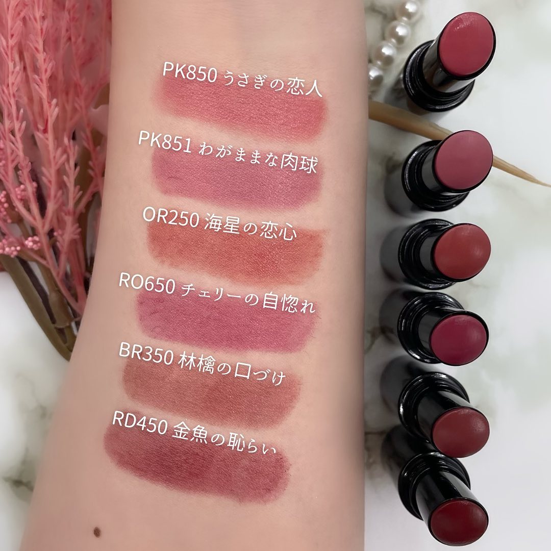 - <BE351 桃のはにかみ> ジフェニルジメチコン、デカエチルヘキサン酸ポリグリセリル-10、(VP/ヘキサデセン)コポリマー、イソドデカン、トリメチルシロキシフェニルジメチコン、テトラエチルヘキサン酸ペンタエリスリチル、トリイソステアリン酸ポリグリセリル-2、合成ワックス、ジメチコン、フェニルトリメチコン、イソステアリン酸デキストリン、DPG、トコフェロール、ヒアルロン酸Na、BHT、(エイコセン/ビニルピロリドン)コポリマー、(エチレン/プロピレン)コポリマー、カルナウバロウ、キャンデリラロウ、キャンデリラロウエステルズ、ジメチルシリル化シリカ、スクワラン、トリイソステアリン酸イソプロピルチタン、ハイドロゲンジメチコン、メチコン、水酸化Al、炭酸Ca、酸化チタン、酸化鉄、黄4、赤202 <BR350 林檎の口づけ> ジフェニルジメチコン、デカエチルヘキサン酸ポリグリセリル-10、(ビニルピロリドン/ヘキサデセン)コポリマー、イソドデカン、トリメチルシロキシフェニルジメチコン、テトラエチルヘキサン酸ペンタエリスリチル、トリイソステアリン酸ポリグリセリル-2、合成ワックス、ジメチコン、フェニルトリメチコン、イソステアリン酸デキストリン、DPG、トコフェロール、ヒアルロン酸Na、BHT、(エイコセン/ビニルピロリドン)コポリマー、(エチレン/プロピレン)コポリマー、アルミナ、カルナウバロウ、キャンデリラロウ、キャンデリラロウエステルズ、シリカ、ジメチルシリル化シリカ、スクワラン、ハイドロゲンジメチコン、炭酸Ca、酸化チタン、酸化鉄、黄4、赤202 <BR352 駆け引きワイン(限定)> ジフェニルジメチコン、デカエチルヘキサン酸ポリグリセリル-10、(VP/ヘキサデセン)コポリマー、イソドデカン、トリメチルシロキシフェニルジメチコン、テトラエチルヘキサン酸ペンタエリスリチル、合成ワックス、ジメチコン、フェニルトリメチコン、トリイソステアリン酸ポリグリセリル-2、イソステアリン酸デキストリン、DPG、トコフェロール、ヒアルロン酸Na、BHT、(エイコセン/ビニルピロリドン)コポリマー、(エチレン/プロピレン)コポリマー、アルミナ、カルナウバロウ、キャンデリラロウ、キャンデリラロウエステルズ、シリカ、ジメチルシリル化シリカ、スクワラン、ハイドロゲンジメチコン、炭酸Ca、酸化チタン、酸化鉄、黄4、赤202 <OR250 海星の恋心> ジフェニルジメチコン、デカエチルヘキサン酸ポリグリセリル-10、(ビニルピロリドン/ヘキサデセン)コポリマー、イソドデカン、トリメチルシロキシフェニルジメチコン、トリイソステアリン酸ポリグリセリル-2、テトラエチルヘキサン酸ペンタエリスリチル、合成ワックス、ジメチコン、フェニルトリメチコン、イソステアリン酸デキストリン、DPG、トコフェロール、ヒアルロン酸Na、BHT、(エイコセン/ビニルピロリドン)コポリマー、(エチレン/プロピレン)コポリマー、アルミナ、カルナウバロウ、キャンデリラロウ、キャンデリラロウエステルズ、シリカ、ジメチルシリル化シリカ、スクワラン、ハイドロゲンジメチコン、炭酸Ca、酸化チタン、酸化鉄、黄4、赤202 <PK850 うさぎの恋人> ジフェニルジメチコン、デカエチルヘキサン酸ポリグリセリル-10、(ビニルピロリドン/ヘキサデセン)コポリマー、イソドデカン、トリメチルシロキシフェニルジメチコン、テトラエチルヘキサン酸ペンタエリスリチル、トリイソステアリン酸ポリグリセリル-2、合成ワックス、ジメチコン、フェニルトリメチコン、イソステアリン酸デキストリン、DPG、トコフェロール、ヒアルロン酸Na、BHT、(エイコセン/ビニルピロリドン)コポリマー、(エチレン/プロピレン)コポリマー、アルミナ、カルナウバロウ、キャンデリラロウ、キャンデリラロウエステルズ、シリカ、ジメチルシリル化シリカ、スクワラン、ハイドロゲンジメチコン、炭酸Ca、酸化チタン、酸化鉄、黄4、赤202 <PK851 わがままな肉球> ジフェニルジメチコン、デカエチルヘキサン酸ポリグリセリル-10、(ビニルピロリドン/ヘキサデセン)コポリマー、イソドデカン、トリメチルシロキシフェニルジメチコン、テトラエチルヘキサン酸ペンタエリスリチル、トリイソステアリン酸ポリグリセリル-2、合成ワックス、ジメチコン、フェニルトリメチコン、イソステアリン酸デキストリン、DPG、トコフェロール、ヒアルロン酸Na、BHT、(エイコセン/ビニルピロリドン)コポリマー、(エチレン/プロピレン)コポリマー、アルミナ、カルナウバロウ、キャンデリラロウ、キャンデリラロウエステルズ、シリカ、ジメチルシリル化シリカ、スクワラン、ハイドロゲンジメチコン、炭酸Ca、酸化チタン、酸化鉄、黄4、赤202 <PK852 桜の微笑み> ジフェニルジメチコン、デカエチルヘキサン酸ポリグリセリル-10、(VP/ヘキサデセン)コポリマー、イソドデカン、トリメチルシロキシフェニルジメチコン、テトラエチルヘキサン酸ペンタエリスリチル、合成ワックス、トリイソステアリン酸ポリグリセリル-2、ジメチコン、フェニルトリメ