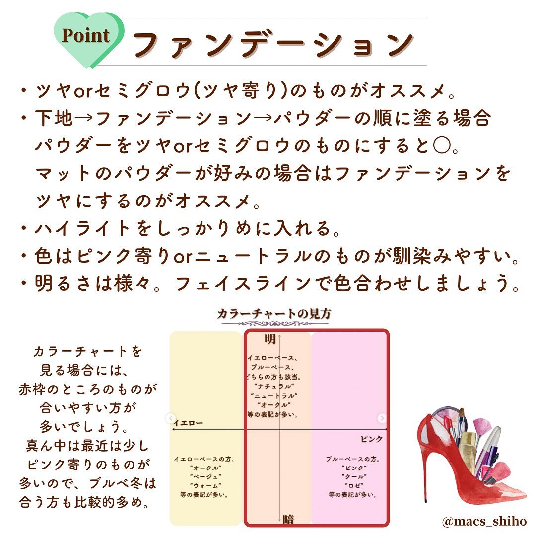 イエローベースAutumn は ブラウンシャドウが得意🙌 ブラウンのグラデーションが基本となり、 ブラウンだけでもとても素敵ですが 色みを入れて印象を変えることは可能👏 共通しているのは、しめ色がしっかりめに 入れるということ😉 必ずしも広い範囲に入れる必要はなく アイラインをぼかす程度の少量でもOK! 引き締め部分がないとぼやけた印象に なってしまいがちです🤔 チークやリップは、ベージュやブラウンが オススメです。 ピンクやオレンジも 使用可能ですが、それだけだと明るく なりすぎてしまう場合があるので、 ベージュやブラウンと重ね付けするか 混ぜて塗ると良いでしょう💡 青み系は顔色が落ちやすいので要注意⚠️ ベースメイクは、セミマットくらいが オススメです。 Autumnの中で 濃いめの色が似合う方はゴージャスな 雰囲気が得意な方もいるので セミグロウくらいでも良さそう😉