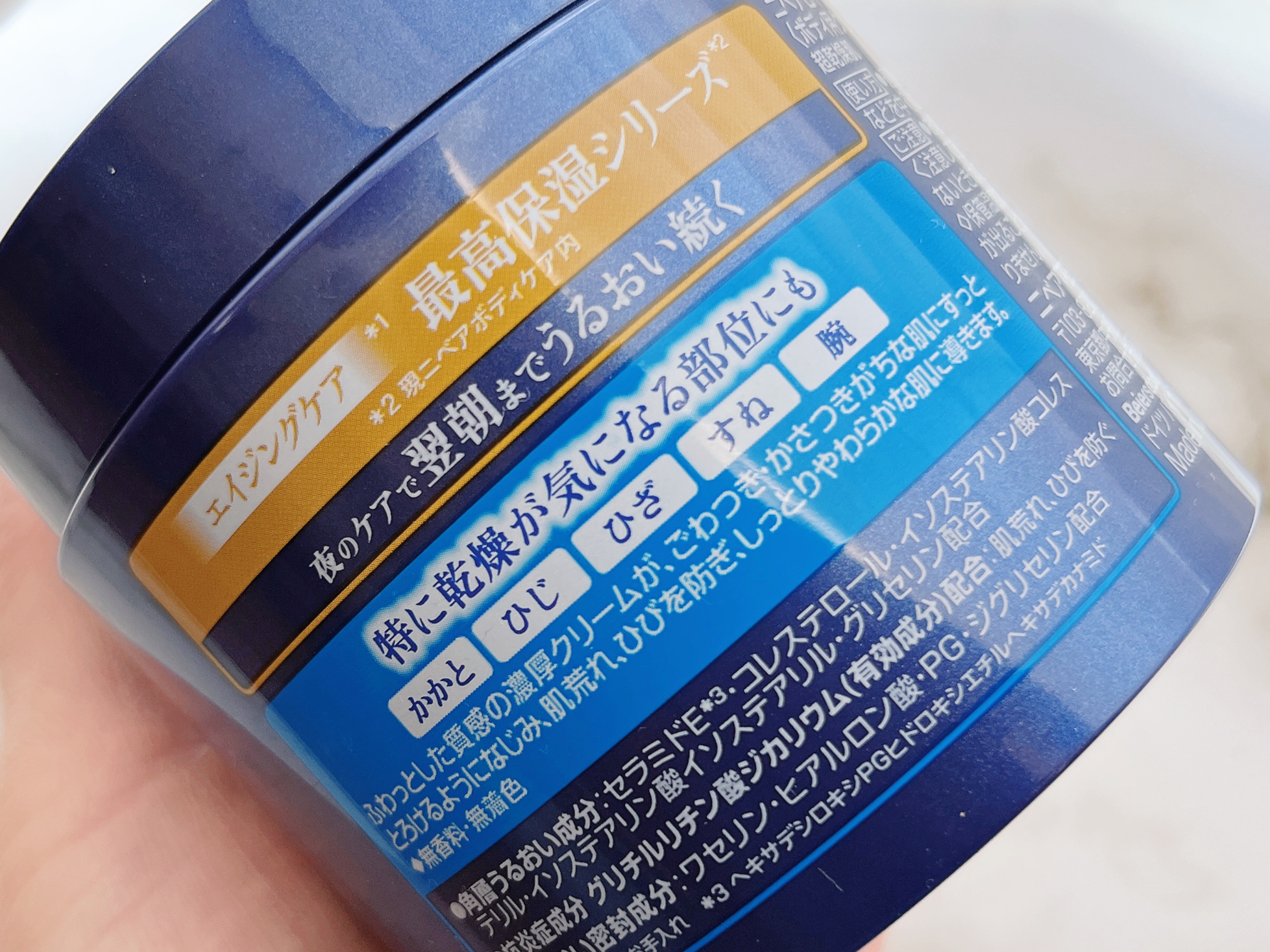 - 【医薬部外品】 エイジングケア*1。最高保湿シリーズ*2ボディクリーム。 ふわっとした質感の濃厚クリームが、ごわつき・かさつきがちな肌にすっととろけるようになじみ、肌荒れ、ひびを防ぎ、しっとりやわらかな肌に導きます。 ◆無香料・無着色 ●抗炎症成分 グリチルリチン酸ジカリウム(有効成分)配合:肌荒れ、ひびを防ぎます。 *1年齢に応じたお手入れ *2現ニベアボディケア内
