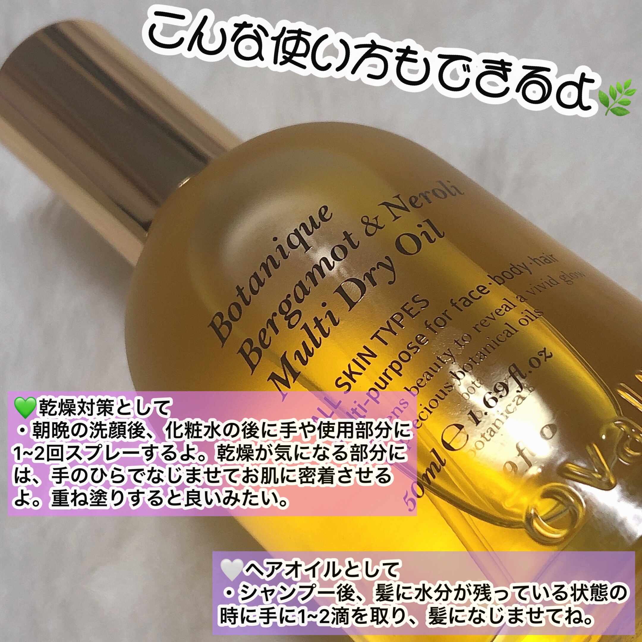 スプレーするといい香りが広がる🍃 オイルだけど馴染ませるとサラッとしてベタつきにくい使い心地を感じました🌟 マルチに使えるし使いやすいスプレータイプなのでこれ1本あれば全身ケアできておすすめです👌