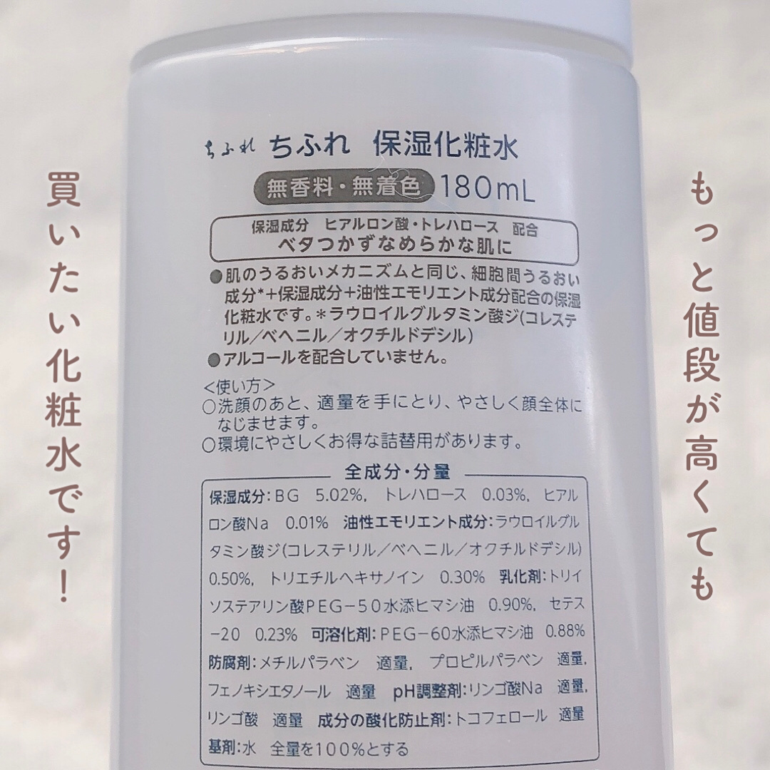 【ちふれ保湿化粧水】のレビューリピート中●使用者(私)やや敏感肌、インナードライ春に一番肌荒れと乾燥を感じる毛穴が詰まりやすい現在は化粧水以降のフェイスケアのみ、緩くグリセリンフリー中ベタつく使用感のものが苦手●香り…なし●保湿力しっかり重ね...
