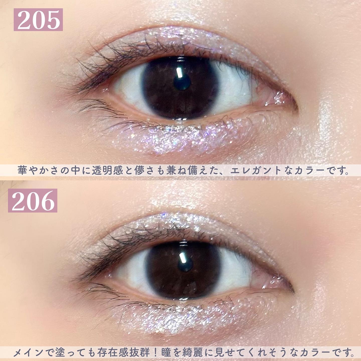 このパレットは、黄味が少なめでブルベにも使いやすいブラウン。 発色はしっかり目だけど、ブラシで調節も可能なので幅広い人に使いやすいパレットだと思います🎀✨ ラメ感も少しずつ異なり、華やかさを抑えたい時は右上を多めに使うと品の良いツヤのあるピンクブラウンメイクになります💎✨ 左上のラメカラーは白っぽいのでどんなアイシャドウとも相性抜群! この可愛い色味と煌びやかなラメは唯一無二です!
