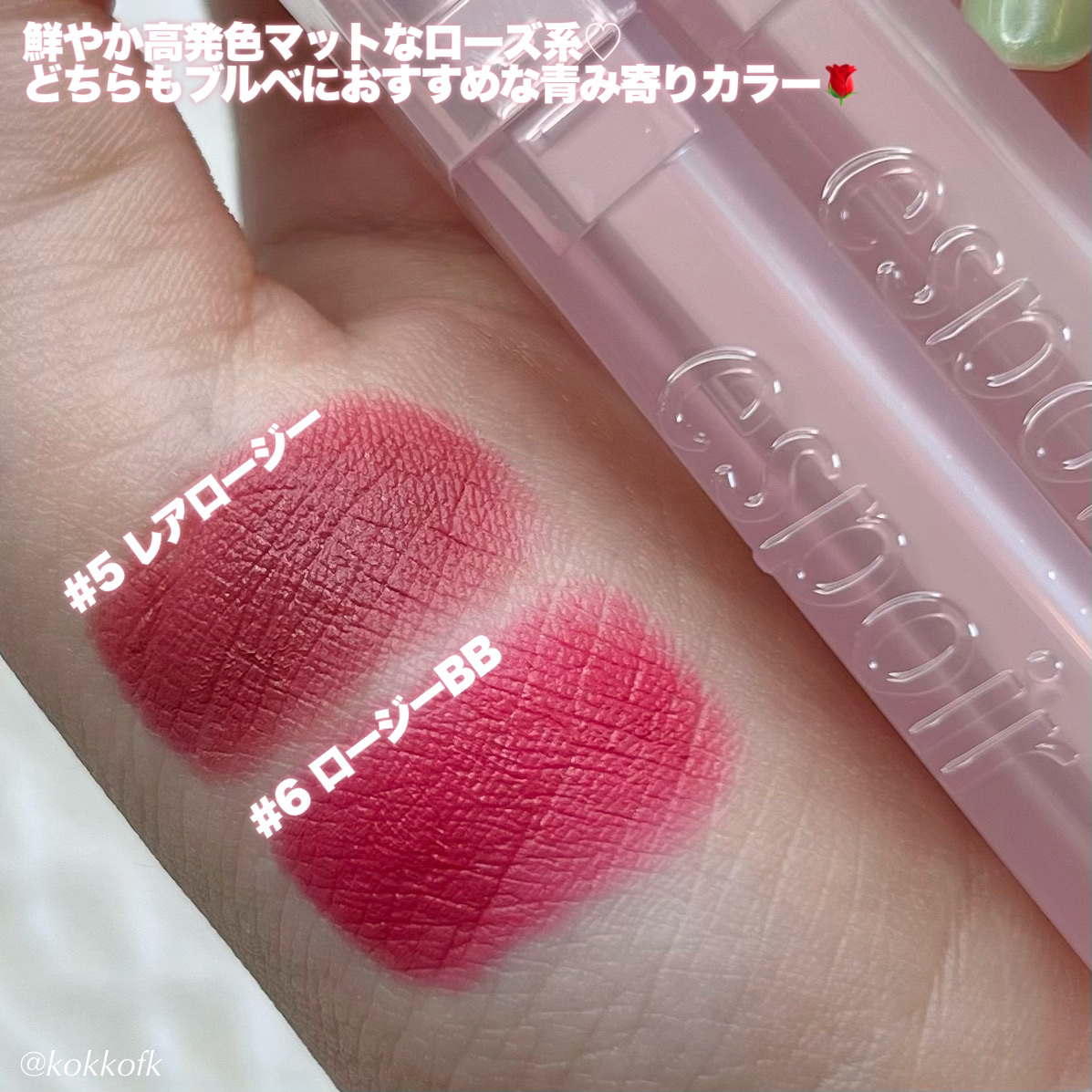 薄く唇に密着する新作マットティント。 マットなのにかなりしっとりとしていて 乾燥を感じなくてびっくりでした! 一気にこなれ感が出るトレンドカラーです♡ やや青みの華やかローズレッド 公式画像より鮮やかめに感じました。 やや黄みの強くて深いオレンジレッド ストロングオータムに超激推しです! やや黄みの非常に深く濃いダークブラウン ディープオータムに激推しです! かわいい雰囲気になれるピンクリップです♡ やや青みの柔らかいくすみピンクベージュ ミューテッドサマーにおすすめです! 青みの落ち着いたローズピンク やや青みのとても鮮やかなビビッドレッド ビビッドウィンターに特におすすめ! 既存マットティントよりもさらに ふわふわなマット感が魅力のリップで、 軽くティッシュオフしてもほとんど落ちない◎ マスクにも激推しのティントなので、 ぜひ皆さんもチェックしてみてね❤︎