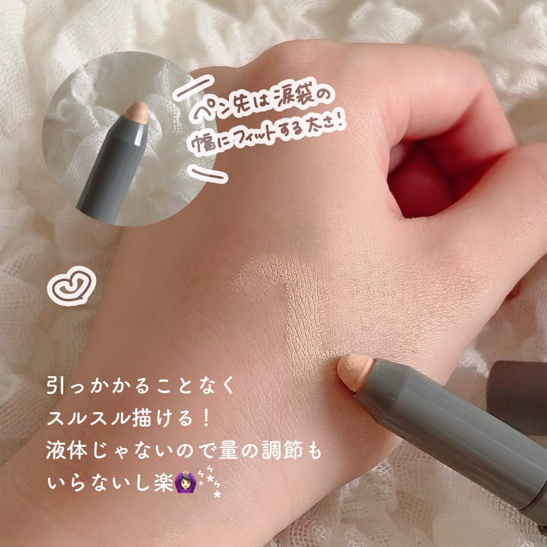 繰り出し繰り戻しのペンタイプのコンシーラー。涙袋や気になる部分にピンポイントで直接塗れて使いやすい◎ コンシーラーとしてのカバー力は中程度かと思いますが、目周りのくすみやクマのカバー、涙袋など、使い勝手が良いので人気があるのも納得◎ ウォータープルーフ仕様というのも嬉しいポイント☝️