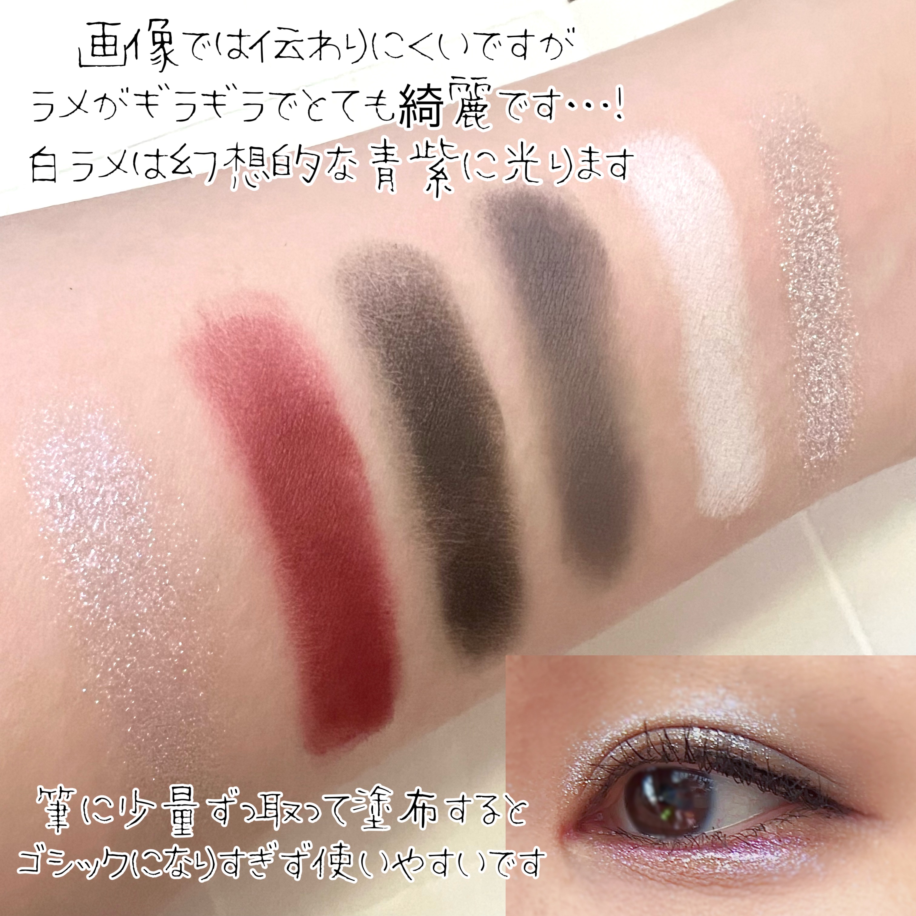 中国コスメの偏光ラメはお人形のようなツヤツヤメイクと相性バッチリですね! 01、02はラメ感控えめなのでギラギラが苦手なかたでも可愛く使えると思います。 旧作の頃からお気に入りで、こればかり使ってきたので超超おすすめできます。