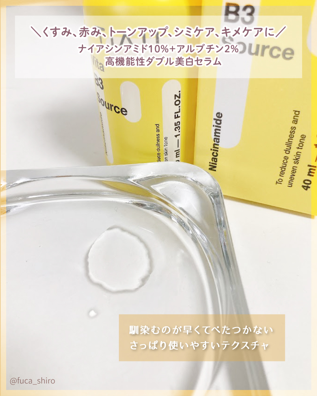 \TIAMVB3ソース/ティアムVB3ソースは、韓国スキンケアブランドティアムのナイアシンアミド10%とアルブチン2%、2種類の白肌成分をW配合した美容液。他にもアラントイン配合で肌をやわらかくし、トーンやキメを整えながら明るく透明感のある肌...