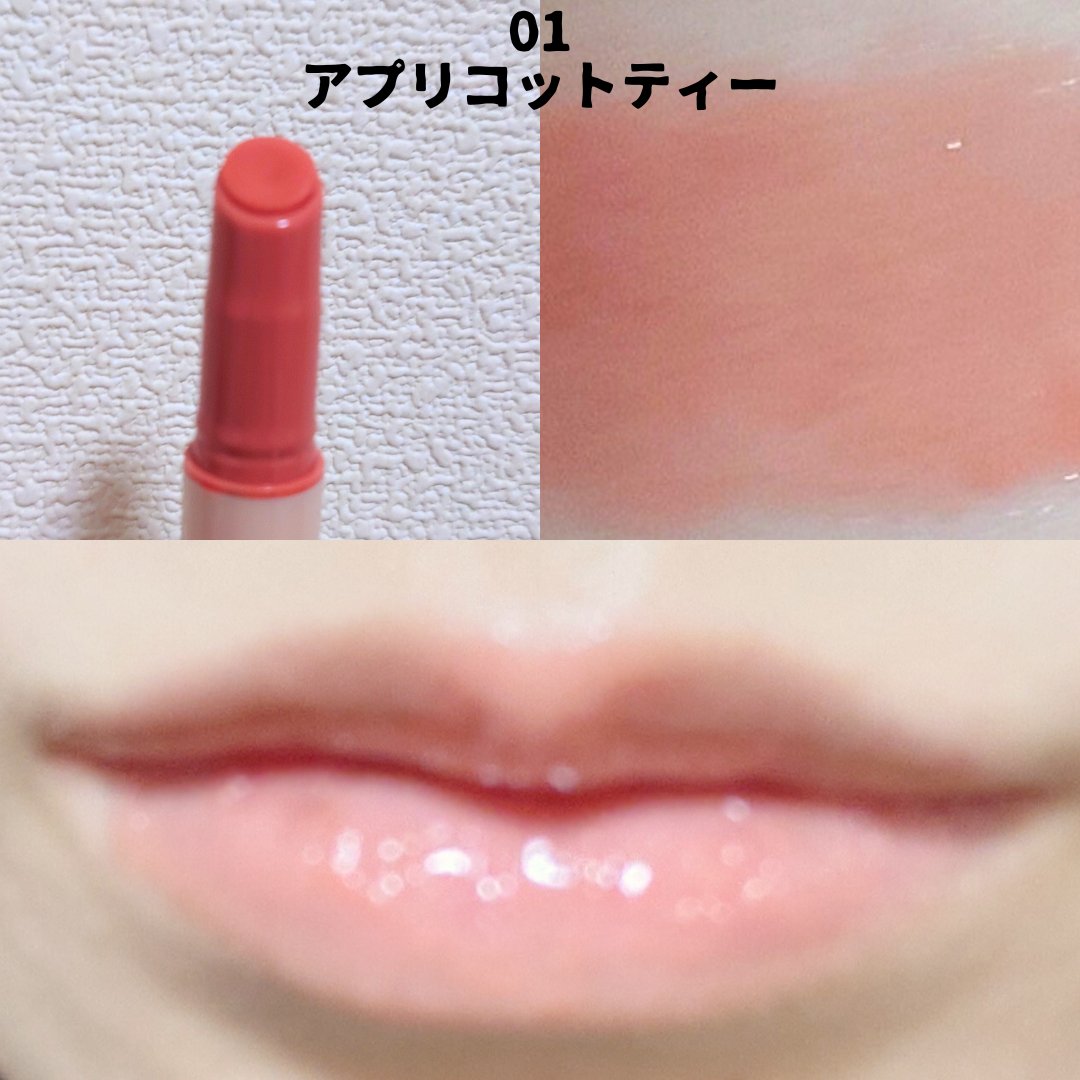 体温でじゅわっととろけるように馴染んで発色してくれるよ❣️ 唇への保湿力もあり色持ちもいい🥰 わたしのお気に入りはアプリコットティーとベリーヨーグルト😆🤍 ノック式なので出しすぎる心配もないよ🎵
