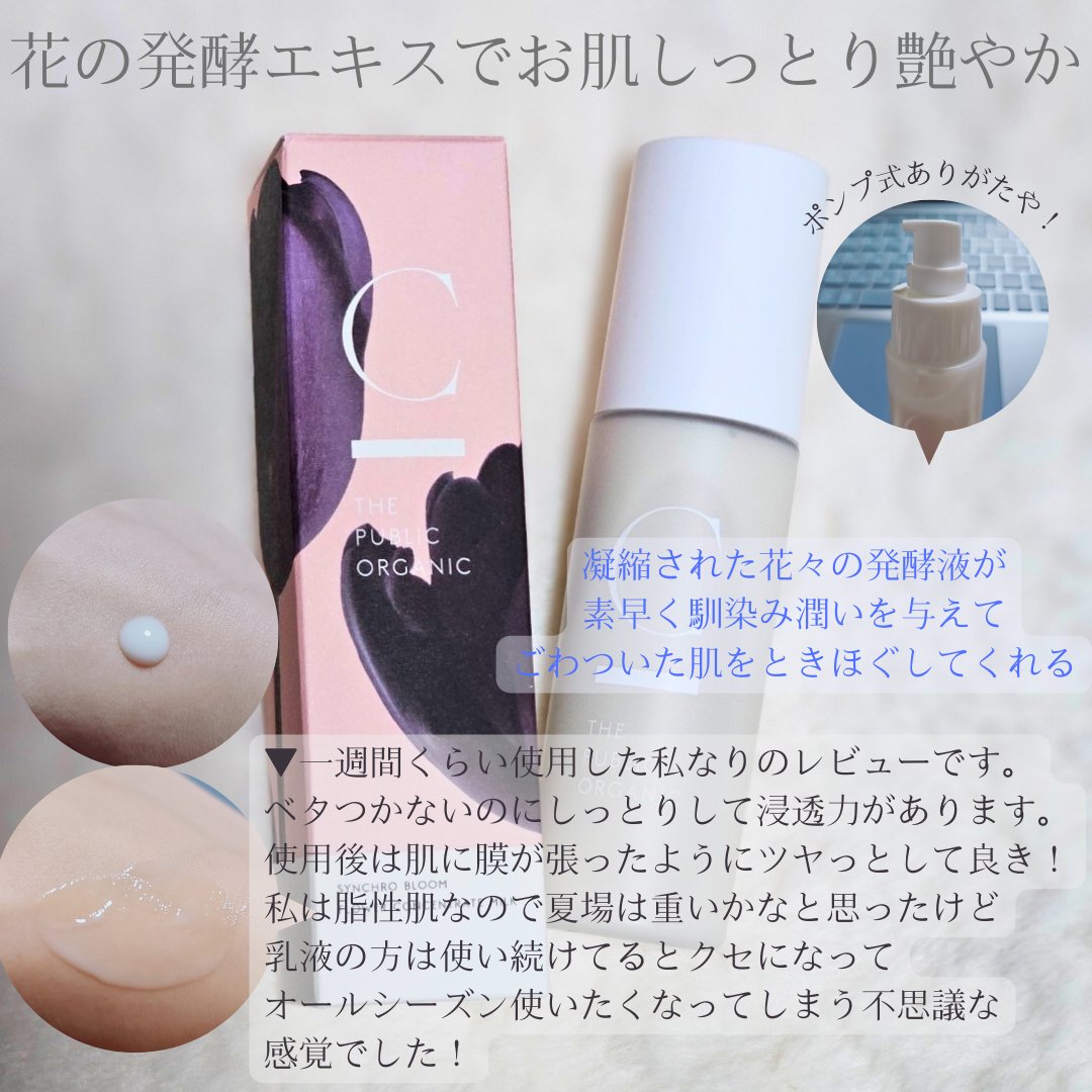 CTHEPUBLICORGANICシンクロブルームフラワーネクターローション 120mlずっと使っているTHEPUBLICORGANICのコスメラインのトナー香りも良くて、サラッとしていて使いやすいです。使っていると肌が柔らかくなり、手...