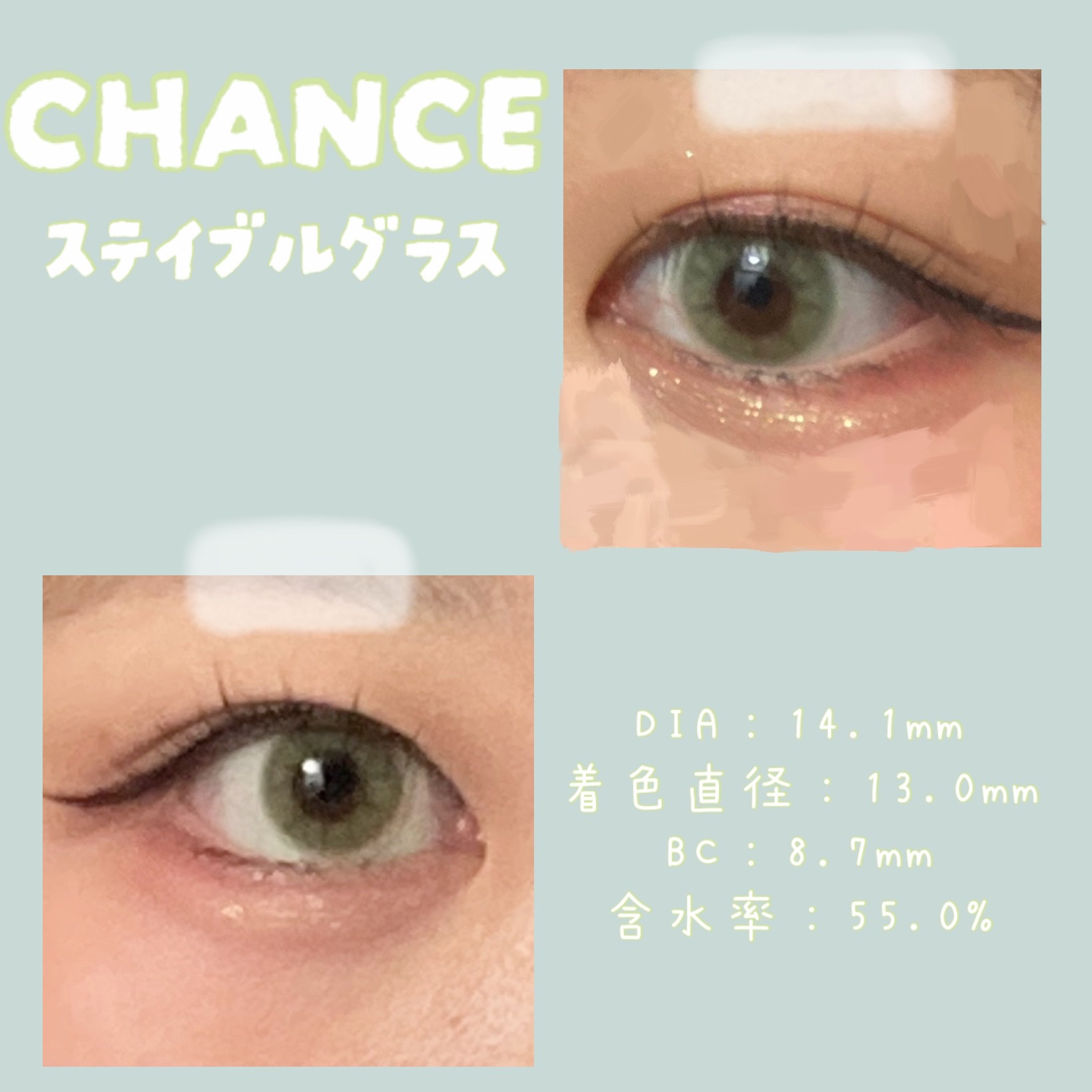 - デザイン・カラー・サイジング・フィッティング全てにこだわり抜いた「CHANCE 1DAY」。 今までのカラコンにはない自然でアンニュイなデザインと絶妙な彩色。さらに業界最高水準スペックを備えDebut。 色褪せる流行、残る個性。あなたの魅力を引き出し、運命を変えられるくらいのインパクトを届けたい。CHANCE(チャンス)を掴むきっかけをこのレンズで。 ■こだわり その(1):「生まれつきの瞳の様な自然さ」にこだわったレンズデザイン 「生まれつきの瞳の様な自然さ」にこだわる為には、デザイン・カラー・サイズの全てにおいて妥協することはできませんでした。 どんな瞳にも溶け込むデザインとカラー。大きすぎず、小さすぎない自然なサイズ。 それが叶った秘密は、極小ドットによるデザインとカラー、そしてDIA14.1mmというサイズ感が重要でした。 ■こだわり その(2):「国内カラコン最高水準のスペック」 瞳への負担を軽減する事にとにかくこだわりました。UVカット、うるおい成分配合(MPC)、なめらかエッジ。またパソコン・スマートフォン等の液晶画面から発生しているブルーライトを軽減するイエロー色素を国内販売のカラーコンタクトレンズで初めて採用致しました。 カラーコンタクトレンズの不適正使用による眼障害の危険性等などがあります。 ●コンタクトレンズは高度管理医療機器です。不十分な洗浄・消毒など不適切なケアや、長時間・交換期間を超えた装用により、アレルギー性結膜炎、角膜感染症、角膜潰瘍等の重篤な眼障害が発生する危険性があります ●ご使用前に取扱説明書を確認してください 使用上の留意事項 ●眼科医院等を受診してからお求めください ●眼に異常を感じたら直ちにレンズ使用を中止し、お近くの眼科等で診察を受けてください ●医師の指示にしたがってご使用ください ●コンタクトレンズを装用する場合、自覚症状がなくても、眼科医院等での定期検査を受けてください ●レンズに不具合がある場合は使用しないでください