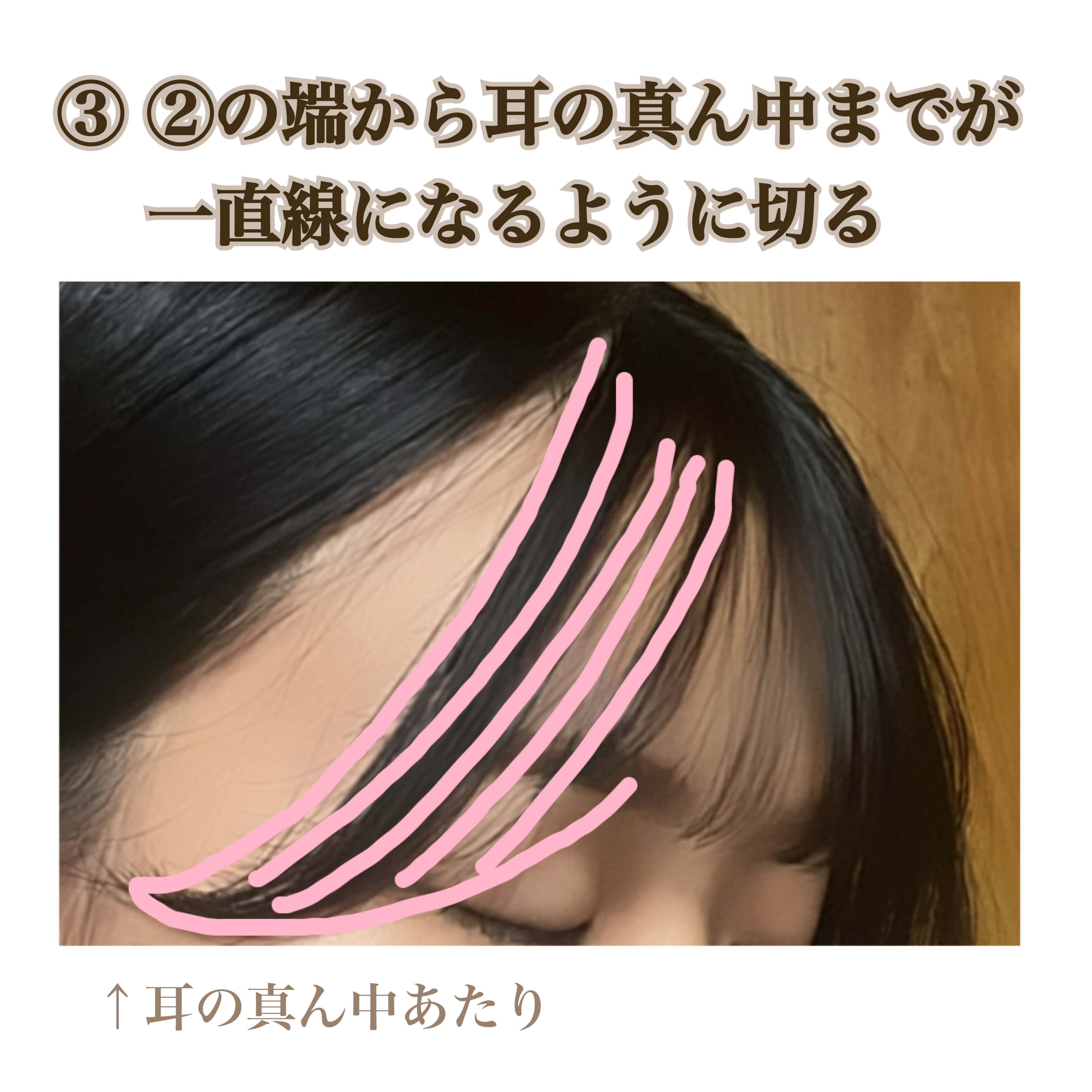 アイロンは絹女のストレートアイロンを使用していますが、ストレートアイロンならなんでも大丈夫です! 前髪を真ん中とサイドに分けます。この時真ん中は大体眉毛の間ぐらいの幅にします。 真ん中の髪を真っ直ぐ下に引っ張って目の下の位置で真っ直ぐに切ります。 サイドを②から耳の真ん中の位置まで一直線に切ります。 ストレートアイロンで巻きます。この時も真ん中とサイドに分けて巻きます。