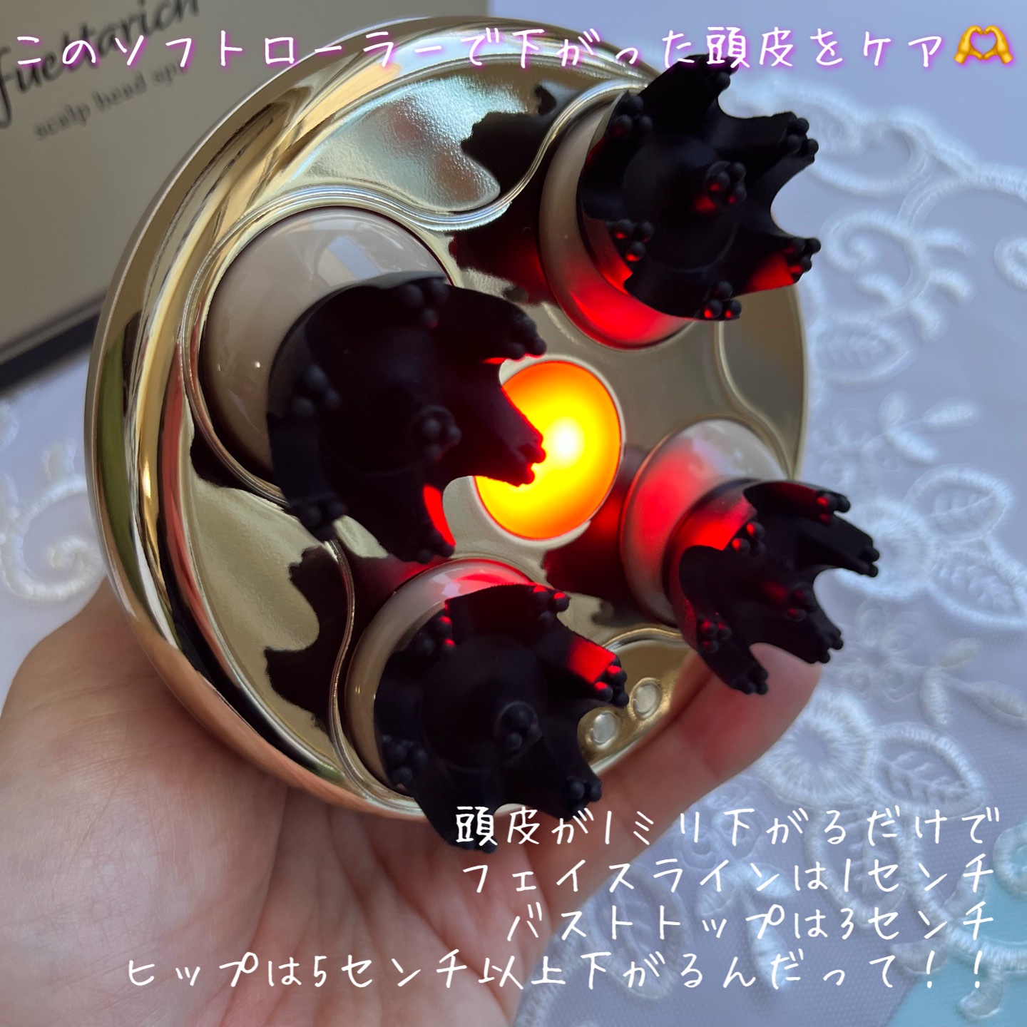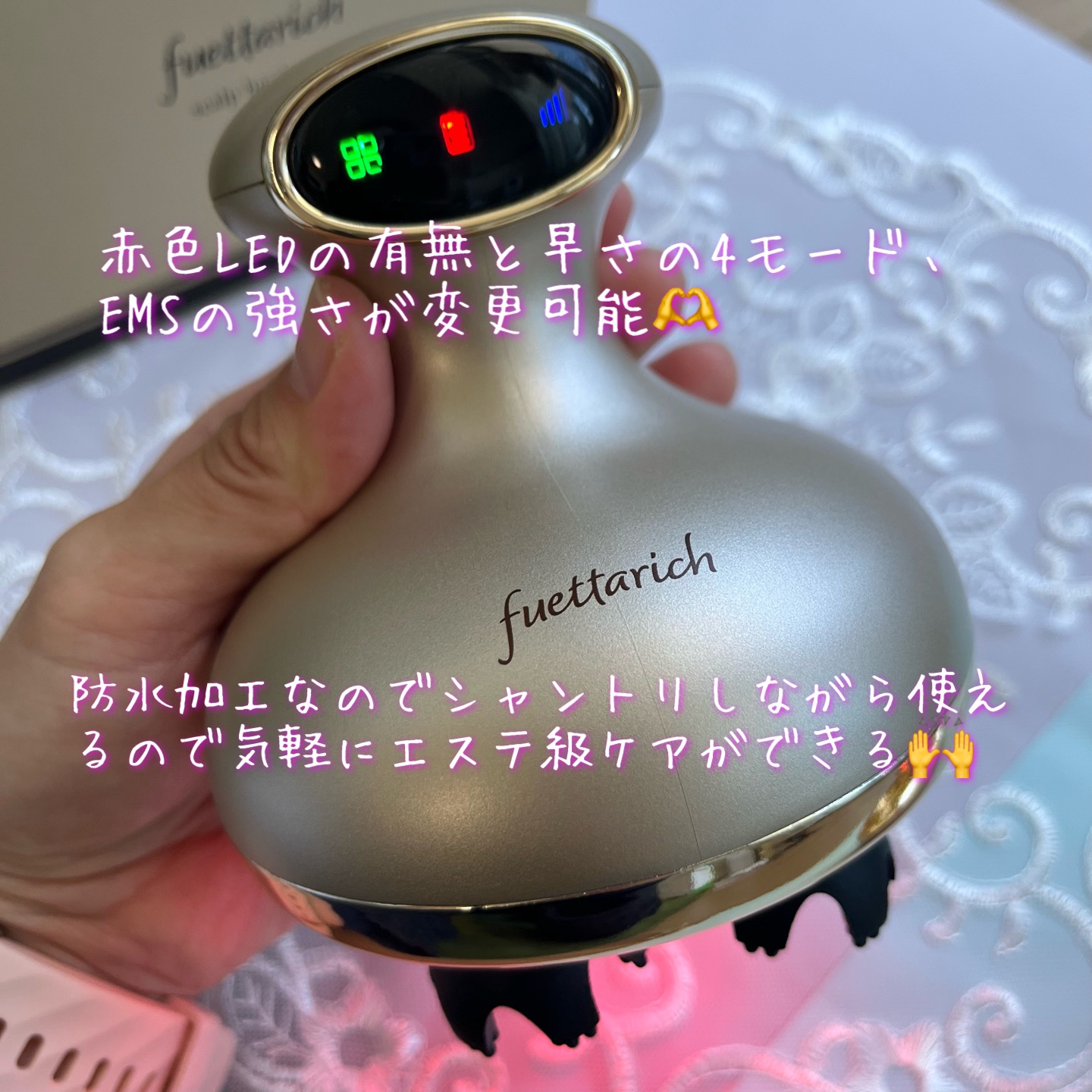 自宅にいながら、ヘッドスパサロンのような体験を楽しめます♪ 赤色LEDによるハリ向上サポート ✔EMSによる筋肉刺激 お風呂でも使える防水タイプで、シャンプー中でも使えますし、頭皮だけでなくフェイスやボディもケア出来る優れモノです。