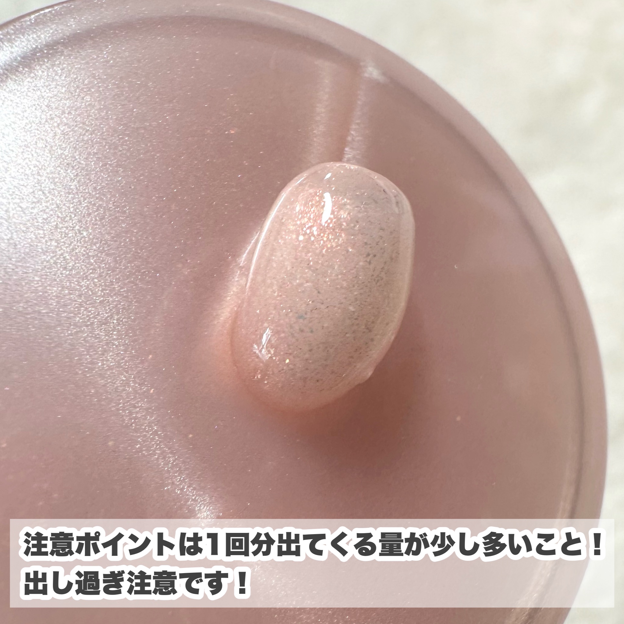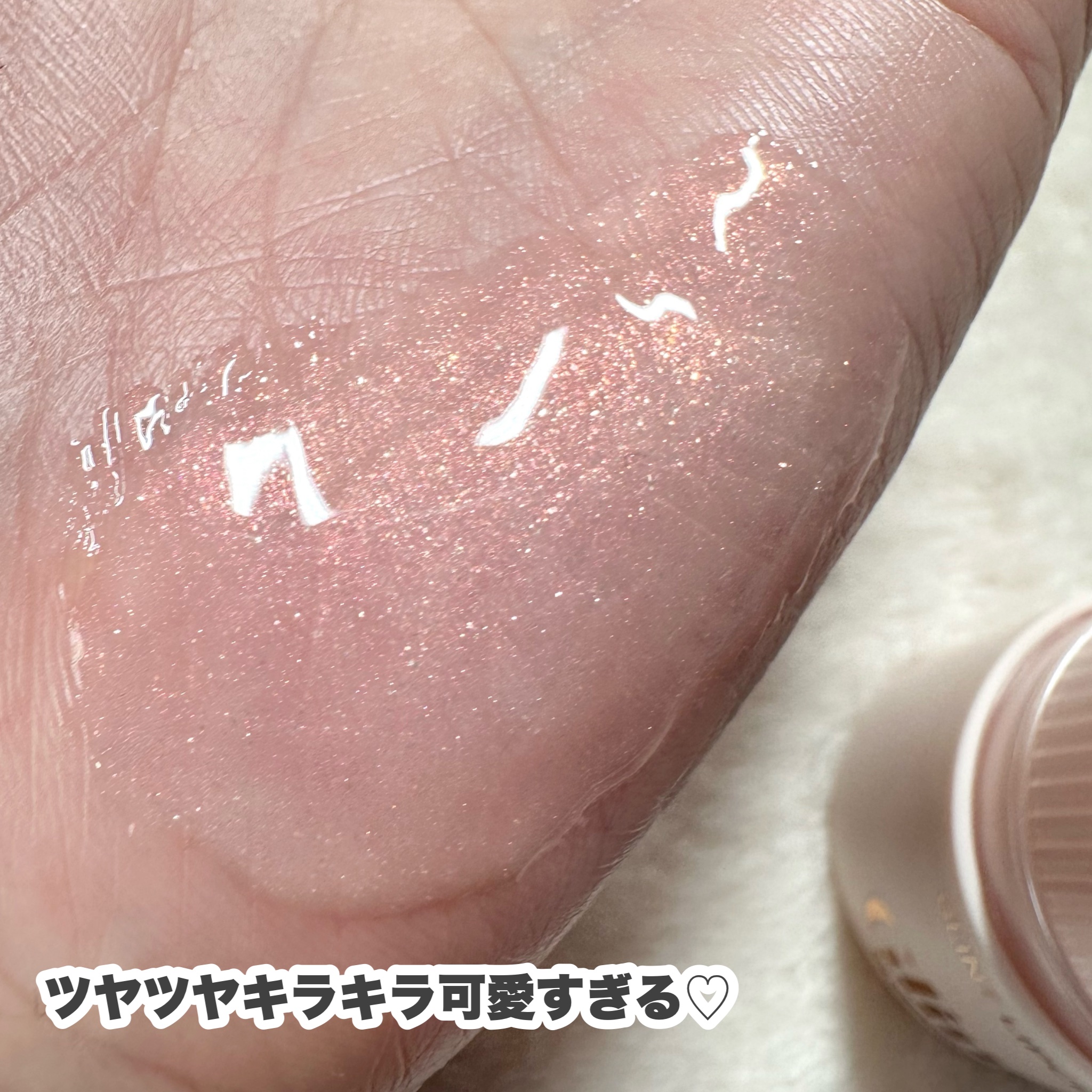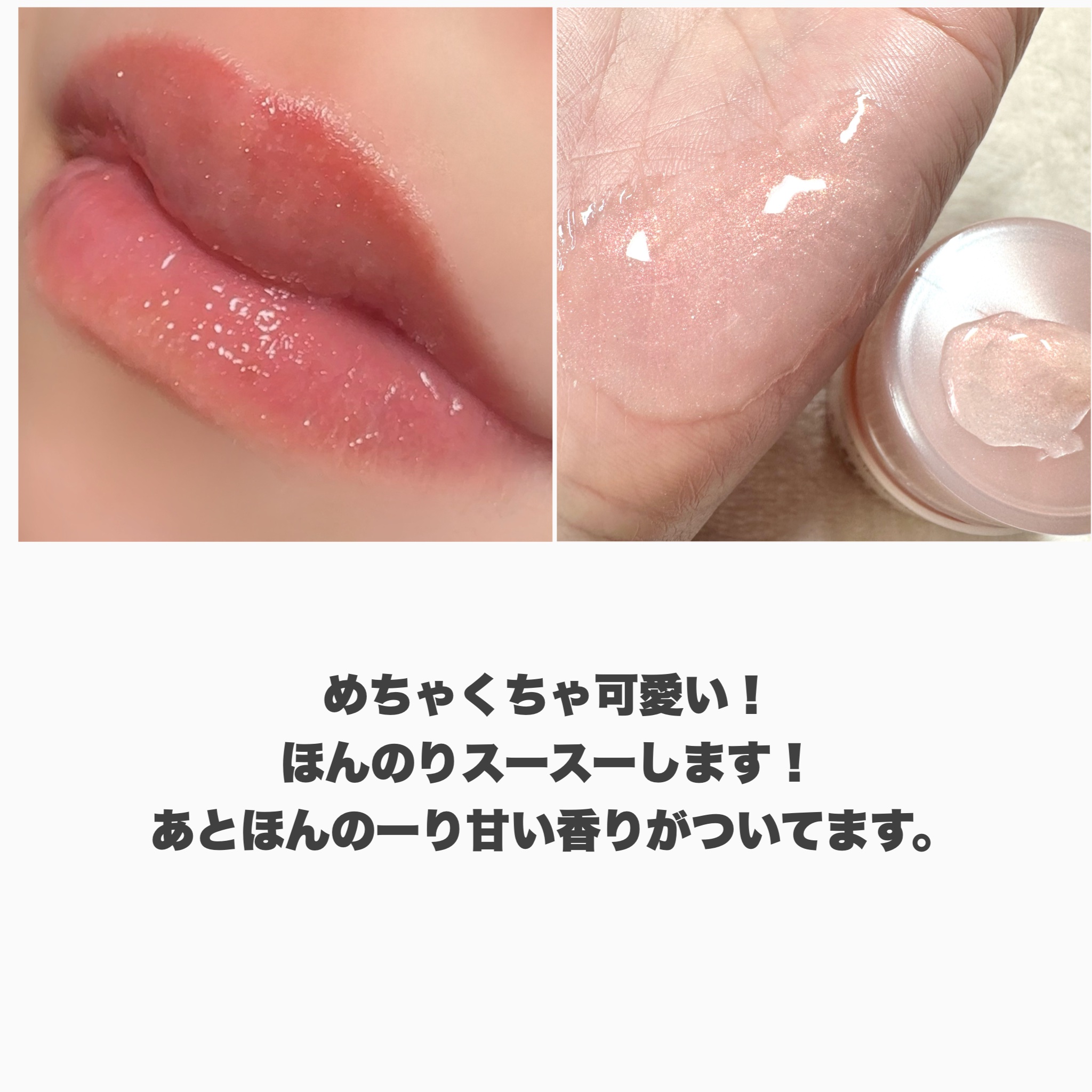 重めのテクスチャー 結構ベタつくし、伸びは良くない ワセリンがリキッドになった感じ 保湿力は最高! ほとんど色はつかない ピンクパールがぎっしり入っていて、所々にオレンジやゴールドパールも見える スースー系のプランプ効果が結構しっかりある パンって唇が腫れてボリュームアップするわけじゃないんだけど、若干血色感が出る