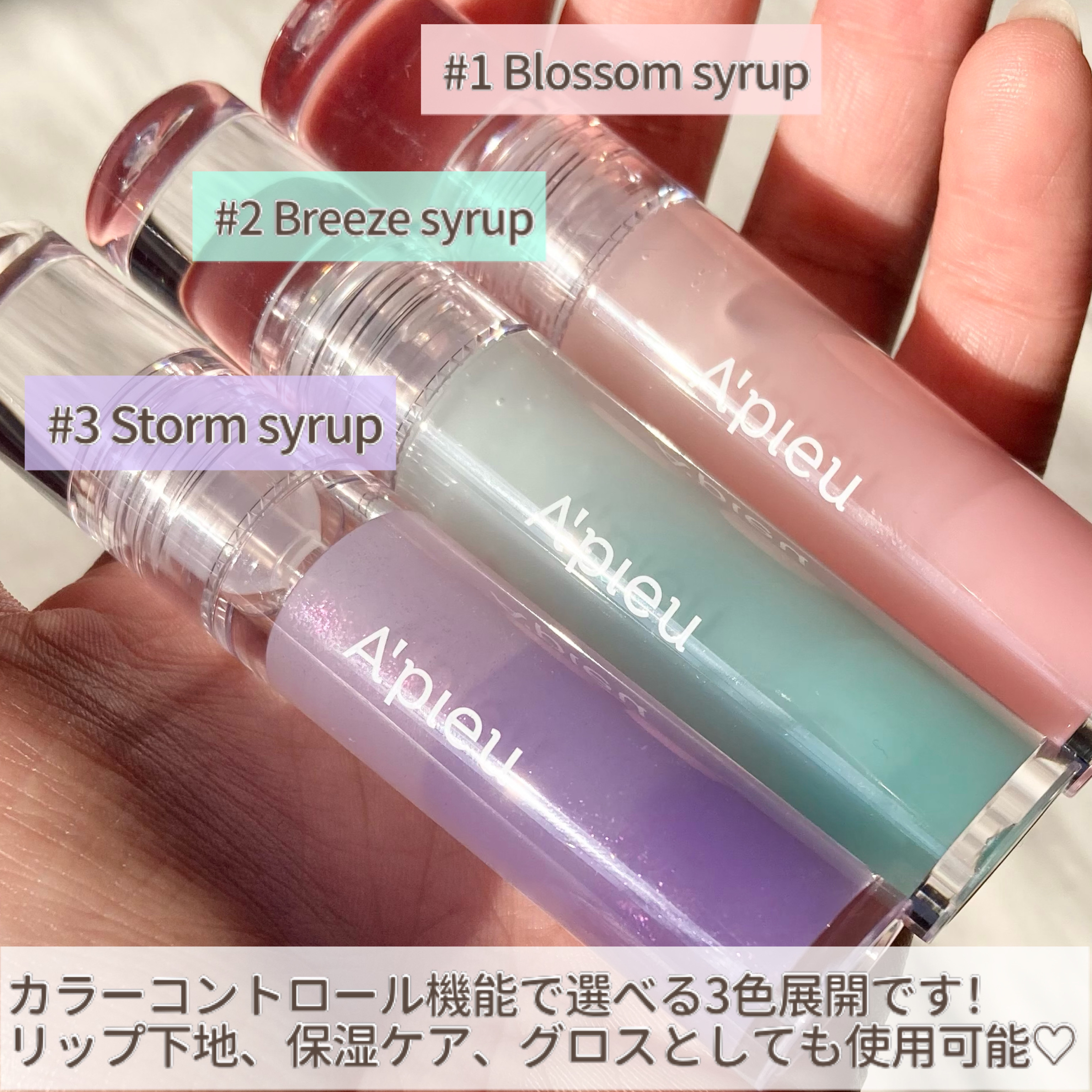 - <#1 ブロッサムシロップ(Blossom syrup)> ポリイソブテン、ビスジグリセリルポリアシルアジペート-2、イソステアリン酸水添ヒマシ油、リンゴ酸ジイソステアリル、ダイマージリノール酸ダイマージリノレイルビス(ベヘニル/イソステアリル/フィトステリル)、メントングリセリンアセタール、マイクロクリスタリンワックス、オクチルドデカノール、ジメチルシリル化シリカ、1,2-ヘキサンジオール、パラフィン、ジステアルジモニウムヘクトライト、炭酸プロピレン、酢酸トコフェロール、トリイソステアリン酸ポリグリセリル-2、バオバブ種子油、酸化チタン、ホホバ種子油、アンズ核油、アーモンド油、オリーブ果実油、月見草油、トリ(カプリル酸/カプリン酸)グリセリル、ツバキ種子油、シア脂、アルガニアスピノサ核油、カニナバラ果実エキス、マンゴー果実エキス、トリエトキシカプリリルシラン、水酸化Al、フェノキシエタノール、赤104(1)、黄4、黄5、香料 <#2 ブリーズシロップ(Breese syrup)> ポリイソブテン、ビスジグリセリルポリアシルアジペート-2、イソステアリン酸水添ヒマシ油、リンゴ酸ジイソステアリル、ダイマージリノール酸ダイマージリノレイルビス(ベヘニル/イソステアリル/フィトステリル)、メントングリセリンアセタール、マイクロクリスタリンワックス、オクチルドデカノール、ジメチルシリル化シリカ、1,2-ヘキサンジオール、パラフィン、ジステアルジモニウムヘクトライト、炭酸プロピレン、酢酸トコフェロール、トリイソステアリン酸ポリグリセリル-2、バオバブ種子油、ホホバ種子油、アンズ核油、アーモンド油、オリーブ果実油、月見草油、トリ(カプリル酸/カプリン酸)グリセリル、ツバキ種子油、シア脂、アルガニアスピノサ核油、カニナバラ果実エキス、マンゴー果実エキス、青1、黄4、黄5、フェノキシエタノール、香料 <#3 ストームシロップ(Storm syrup)> ポリイソブテン、ビスジグリセリルポリアシルアジペート-2、イソステアリン酸水添ヒマシ油、リンゴ酸ジイソステアリル、ダイマージリノール酸ダイマージリノレイルビス(ベヘニル/イソステアリル/フィトステリル)、メントングリセリンアセタール、マイクロクリスタリンワックス、オクチルドデカノール、ジメチルシリル化シリカ、1,2-ヘキサンジオール、パラフィン、ジステアルジモニウムヘクトライト、ホウケイ酸(Ca/Al)、炭酸プロピレン、酢酸トコフェロール、トリイソステアリン酸ポリグリセリル-2、バオバブ種子油、酸化チタン、酸化スズ、ホホバ種子油、アンズ核油、アーモンド油、オリーブ果実油、月見草油、トリ(カプリル酸/カプリン酸)グリセリル、ツバキ種子油、シア脂、アルガニアスピノサ核油、カニナバラ果実エキス、マンゴー果実エキス、赤104(1)、青1、黄5、黄4、フェノキシエタノール、香料