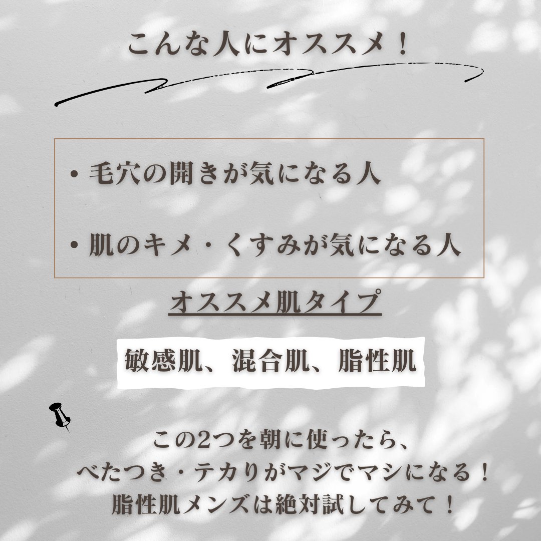 2種の有効成分で「ニキビケア」と「美白ケア」ができる! EPCと呼ばれる成分で、皮脂抑制効果などによるニキビケア・毛穴ケアができる! 男性にこそぴったりな化粧水です! 浸透感抜群で、めんどくさがりな男性でも使いやすい! さらっとした使用感なのに保湿感もしっかりある! 重要な成分「EPC」が入っていたり、層状ナノカプセル技術※が使われていたりとプチプラでは出せない要素がしっかり詰まっています! 成分・使用感で見ても、他の化粧水とは明らかにワンランク上ですので まだ使ったことがない方はは是非お試し下さい!