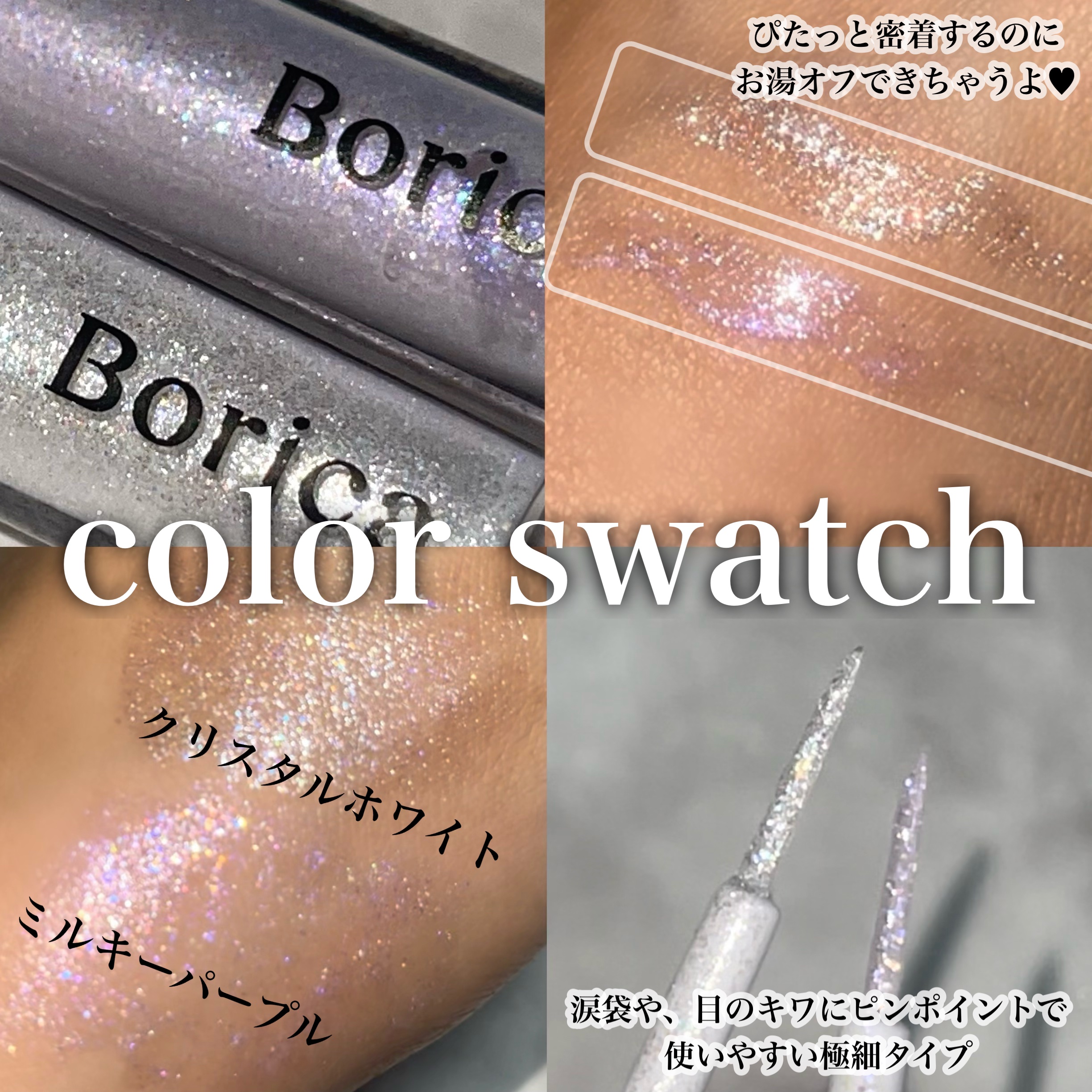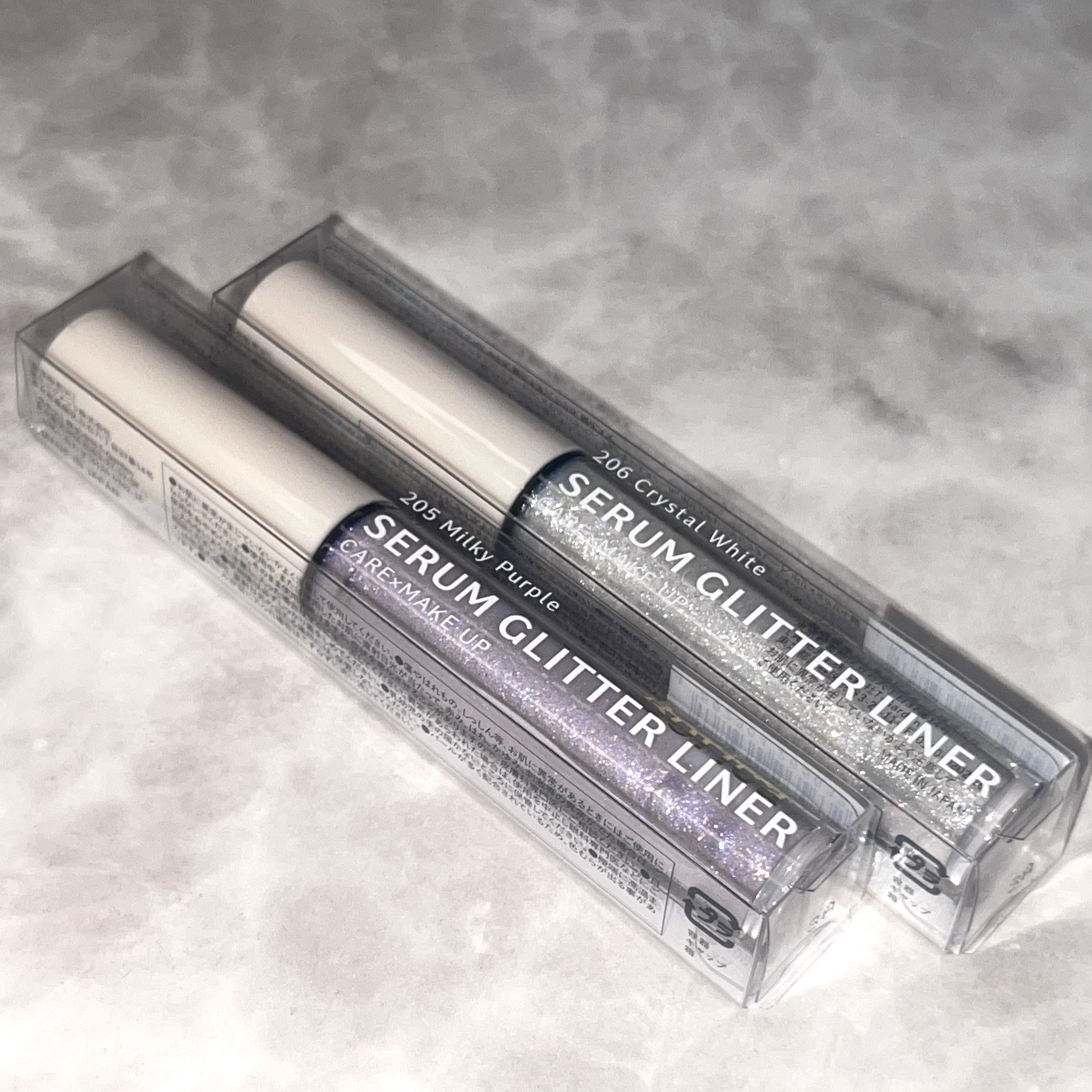 細かいラメが引けるライナーになります。細めの筆でのせやすいのもお気に入りポイント。 グリッターほどやりすぎ感がなく、何も塗っていない時より自然な存在感が出るので、 美容液成分が配合されているようです。確かに一日中つけていても乾燥は感じにくかったです。