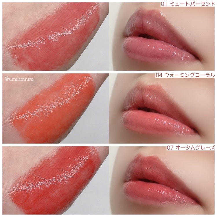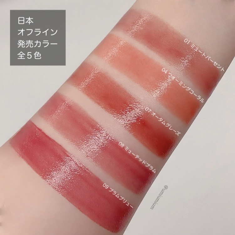 - <01 ミュートパーセント> リンゴ酸ジイソステアリル、ダイマージリノール酸ダイマージリノレイルビス(ベヘニル/イソステアリル/フィトステリル)、ビスジグリセリルポリアシルアジペート 2、デカイソステアリン酸ポリグリセリル 10、トリイソステアリン酸ポリグリセリル 2、水添ポリイソブテン、ジイソステアリン酸ポリグリセリル 3、トリメリト酸トリトリデシル、ダイマージリノール酸ジオクチルドデシル、パラフィン、マイクロクリスタリンワックス、(セバシン酸/イソパルミチン酸)ジグリセリル、酸化チタン、オクチルドデカノール、合成ワックス、黄5、プロパンジオール、赤227、(エチレン/プロピレン)コポリマー、ジステアルジモニウムヘクトライト、香料、酸化鉄、赤202、ジイソステアリン酸ポリグリセリル 2、青1、炭酸プロピレン、水、トコフェロール、BG、1,2 ヘキサンジオール、ココヤシ果実エキス、スイカ果実エキス、グレープフルーツ果実エキス、モモ果実エキス、ザクロ果実エキス、リンゴ果実エキス、エチルヘキシルグリセリン <04 ウォーミングコーラル> ダイマージリノール酸ダイマージリノレイルビス(ベヘニル/イソステアリル/フィトステリル)、リンゴ酸ジイソステアリル、ビスジグリセリルポリアシルアジペート 2、デカイソステアリン酸ポリグリセリル 10、トリイソステアリン酸ポリグリセリル 2、水添ポリイソブテン、ジイソステアリン酸ポリグリセリル 3、トリメリト酸トリトリデシル、ダイマージリノール酸ジオクチルドデシル、パラフィン、マイクロクリスタリンワックス、(セバシン酸/イソパルミチン酸)ジグリセリル、オクチルドデカノール、酸化チタン、合成ワックス、赤104(1)、酸化鉄、黄5、プロパンジオール、黄4、(エチレン/プロピレン)コポリマー、ジステアルジモニウムヘクトライト、香料、ジイソステアリン酸ポリグリセリル 2、炭酸プロピレン、水、トコフェロール、BG、1,2 ヘキサンジオール、ココヤシ果実エキス、スイカ果実エキス、グレープフルーツ果実エキス、モモ果実エキス、ザクロ果実エキス、リンゴ果実エキス、エチルヘキシルグリセリン <07 オータムグレーズ> ダイマージリノール酸ダイマージリノレイルビス(ベヘニル/イソステアリル/フィトステリル)、リンゴ酸ジイソステアリル、ビスジグリセリルポリアシルアジペート-2、デカイソステアリン酸ポリグリセリル-10、トリイソステアリン酸ポリグリセリル-2、水添ポリイソブテン、ジイソステアリン酸ポリグリセリル-3、トリメリト酸トリトリデシル、ダイマージリノール酸ジオクチルドデシル、パラフィン、マイクロクリスタリンワックス、(セバシン酸/イソパルミチン酸)ジグリセリル、オクチルドデカノール、酸化チタン、酸化鉄、合成ワックス、黄5、プロパンジオール、赤202、(エチレン/プロピレン)コポリマー、ジイソステアリン酸ポリグリセリル-2、ジステアルジモニウムヘクトライト、香料、青1、赤227、炭酸プロピレン、水、トコフェロール、BG、1、2-ヘキサンジオール、ココヤシ果実エキス、スイカ果実エキス、グレープフルーツ果実エキス、モモ果実エキス、ザクロ果実エキス、リンゴ果実エキス、エチルヘキシルグリセリン <08 ミューテッドプラム> ダイマージリノール酸ダイマージリノレイルビス(ベヘニル/イソステアリル/フィトステリル)、リンゴ酸ジイソステアリル、ビスジグリセリルポリアシルアジペート 2、デカイソステアリン酸ポリグリセリル 10、トリイソステアリン酸ポリグリセリル 2、水添ポリイソブテン、ジイソステアリン酸ポリグリセリル 3、トリメリト酸トリトリデシル、ダイマージリノール酸ジオクチルドデシル、パラフィン、マイクロクリスタリンワックス、(セバシン酸/イソパルミチン酸)ジグリセリル、オクチルドデカノール、酸化チタン、合成ワックス、酸化鉄、黄5、プロパンジオール、赤202、(エチレン/プロピレン)コポリマー、赤227、ジイソステアリン酸ポリグリセリル 2、ジステアルジモニウムヘクトライト、香料、赤104(1)、青1、炭酸プロピレン、水、トコフェロール、BG、1,2 ヘキサンジオール、ココヤシ果実エキス、スイカ果実エキス、グレープフルーツ果実エキス、モモ果実エキス、ザクロ果実エキス、リンゴ果実エキス、エチルヘキシルグリセリン <09 プラムブリュー> ダイマージリノール酸ダイマージリノレイルビス(ベヘニル/イソステアリル/フィトステリル)、リンゴ酸ジイソステアリル、ビスジグリセリルポリアシルアジペート 2、デカイソステアリン酸ポリグリセリル 10、トリイソステアリン酸ポリグリセリル 2、水添ポリイソブテン、ジイソステアリン酸ポリグリセリル 3、トリメリト酸トリトリデシル、ダイマージリノール酸ジオクチルドデシル、パラフィン、マイクロクリスタリンワックス、(セバシン酸/イソパルミチン酸)ジグリセリル、オクチルドデカノール、酸化チタン、合成ワックス、赤202、プロパンジオール、酸化鉄、黄5、赤227、(エチレン/プ