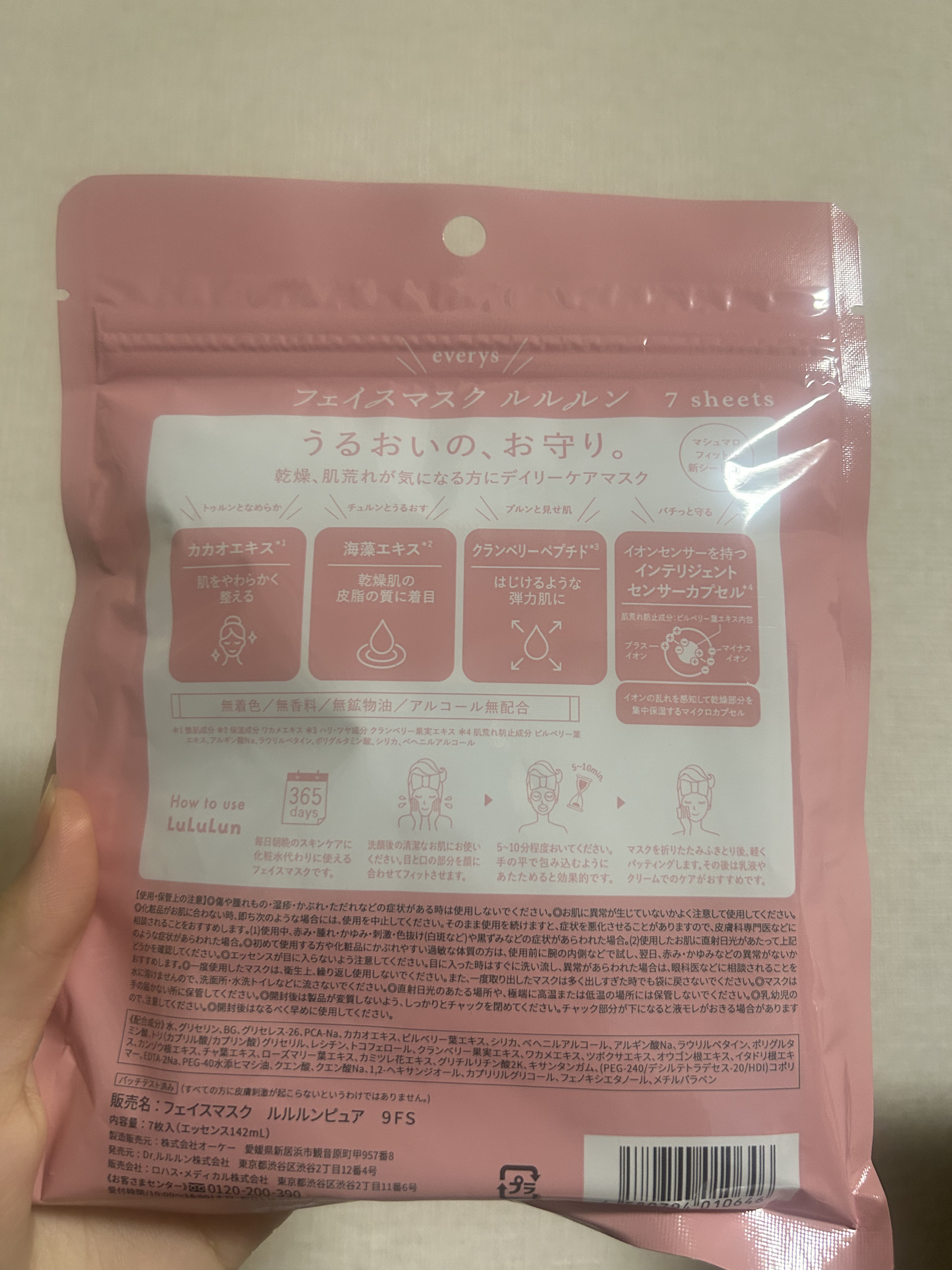 - <ルルルンピュア エブリーズ 32枚入> 水、グリセリン、BG、グリセレス-26、PCA-Na、カカオエキス、ビルベリー葉エキス、シリカ、ベヘニルアルコール、アルギン酸Na、ラウリルベタイ ン、ポリグルタミン酸、トリ(カプリル酸/カプリン酸)グリセリル、レシチン、トコフェロール、クランベリー果実エキス、ワカメエキス、ツボクサエキス、オウ ゴン根エキス、イタドリ根エキス、カンゾウ根エキス、チャ葉エキス、ローズマリー葉エキス、カミツレ花エキス、グリチルリチン酸2K、キサンタンガム、(PEG240/デシルテトラデセス-20/HDI)コポリマー、EDTA-2Na、PEG-40水添ヒマシ油、クエン酸、クエン酸Na、1,2-へキサンジオール、カプリリルグリコール、フェノキ シエタノール、メチルパラベン <ルルルンピュア エブリーズ 7枚入> 水、グリセリン、BG、グリセレス-26、PCA-Na、カカオエキス、ビルベリー葉エキス、シリカ、ベヘニルアルコール、アルギン酸Na、ラウリルベタイ ン、ポリグルタミン酸、トリ(カプリル酸/カプリン酸)グリセリル、レシチン、トコフェロール、クランベリー果実エキス、ワカメエキス、ツボクサエキス、オウ ゴン根エキス、イタドリ根エキス、カンゾウ根エキス、チャ葉エキス、ローズマリー葉エキス、カミツレ花エキス、グリチルリチン酸2K、キサンタンガム、(PEG240/デシルテトラデセス-20/HDI)コポリマー、EDTA-2Na、PEG-40水添ヒマシ油、クエン酸、クエン酸Na、1,2-へキサンジオール、カプリリルグリコール、フェノキ シエタノール、メチルパラベン <ルルルンピュア ピンク(バランス) 7枚入【旧】> 水、グリセリン、BG、PCA-Na、グリチルリチン酸2K、ビルベリー葉エキス、シャクヤク花エキス、クランベリー果実エキス、乳酸桿菌発酵液、バチルス発酵物、レシチン、シトステロール、パルミチン酸アスコルビル、グルコノラクトン、グルタミン酸ジ酢酸4Na、ベンジルアルコール、アルギン酸Na、ラウリルベタイン、ポリグルタミン酸、シリカ、ベヘニルアルコール、水酸化Na、PEG-40水添ヒマシ油、キサンタンガム、クエン酸、クエン酸Na、フェノキシエタノール、メチルパラベン <ルルルンピュア ピンク(バランス) 36枚入【旧】> 水、グリセリン、BG、PCA-Na、グリチルリチン酸2K、ビルベリー葉エキス、シャクヤク花エキス、クランベリー果実エキス、乳酸桿菌発酵液、バチルス発酵物、レシチン、シトステロール、パルミチン酸アスコルビル、グルコノラクトン、グルタミン酸ジ酢酸4Na、ベンジルアルコール、アルギン酸Na、ラウリルベタイン、ポリグルタミン酸、シリカ、ベヘニルアルコール、水酸化Na、PEG-40水添ヒマシ油、キサンタンガム、クエン酸、クエン酸Na、フェノキシエタノール、メチルパラベン