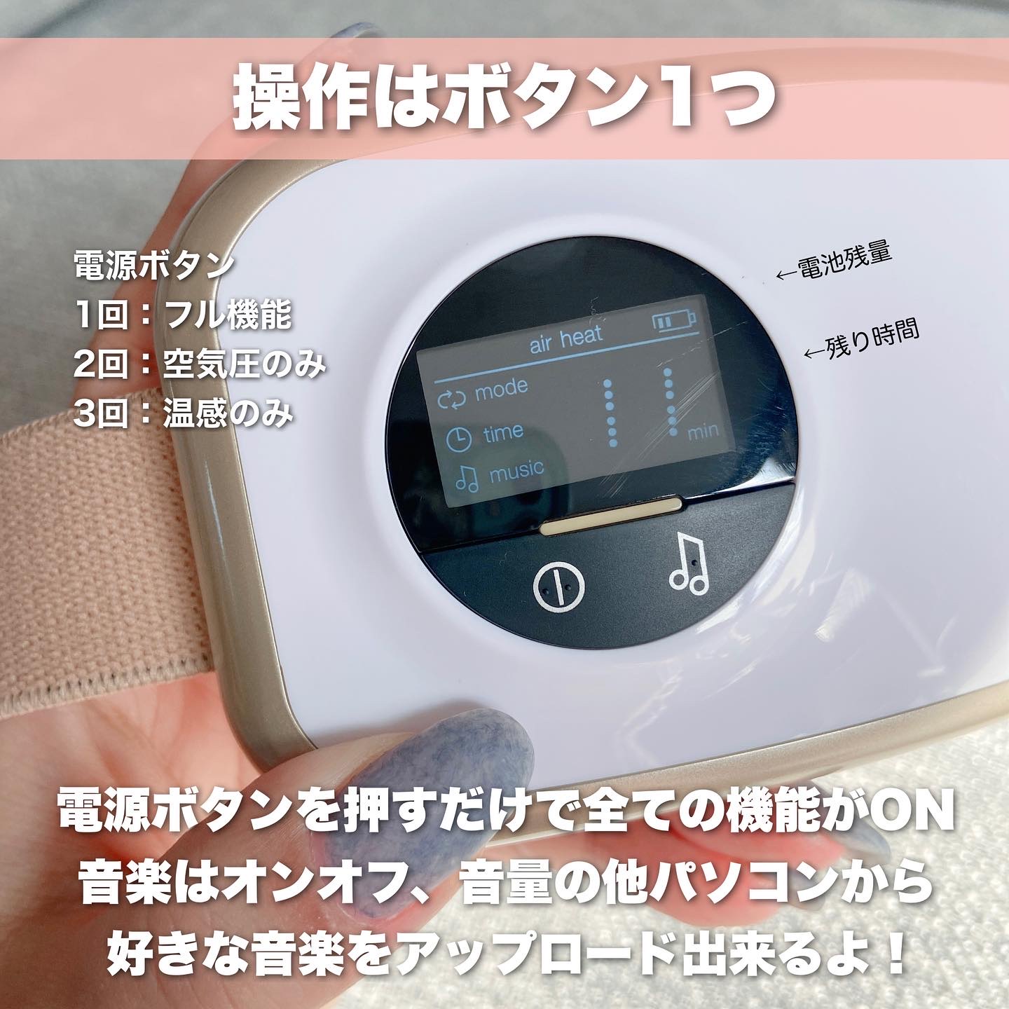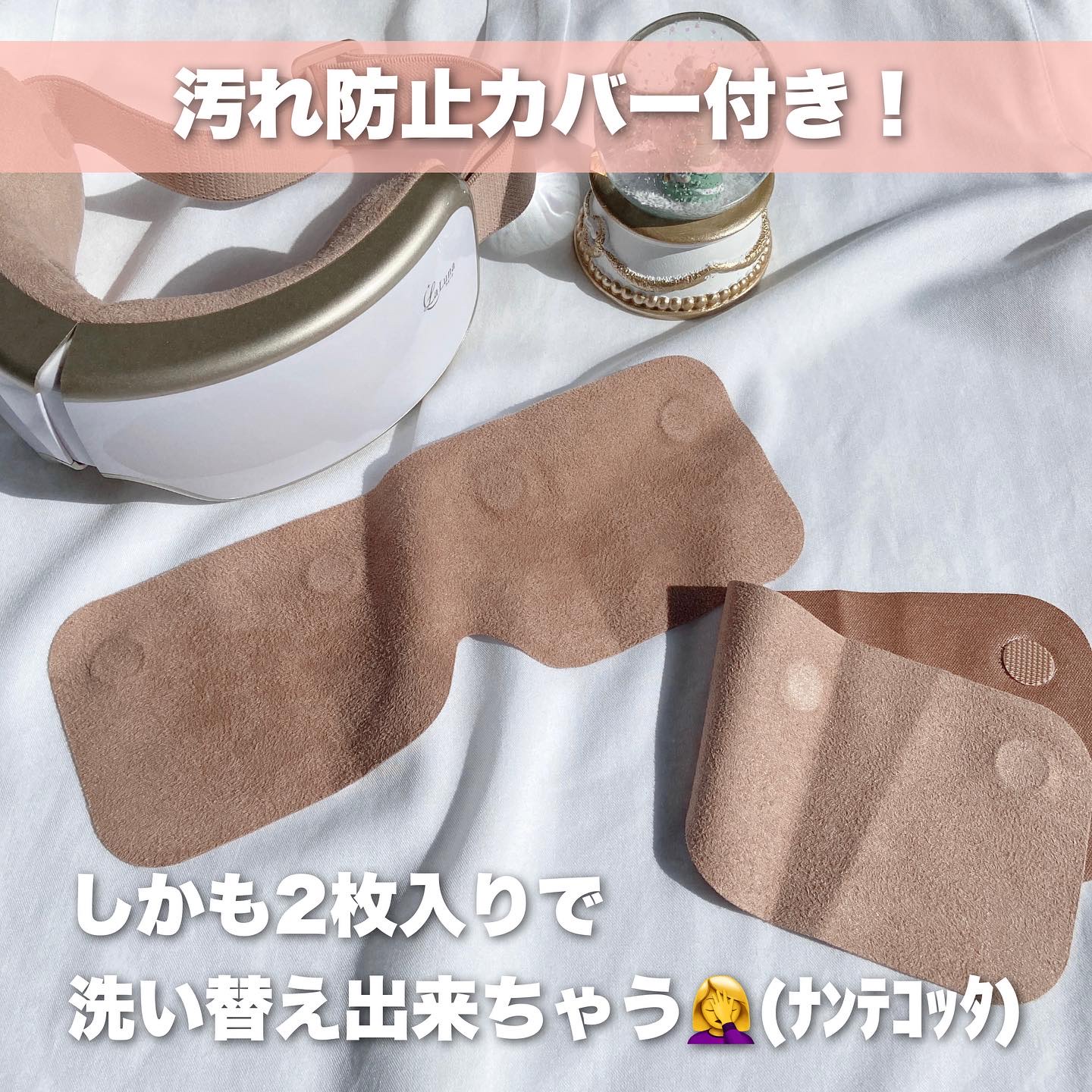 - 電源オンで手軽に目元エステ気分を満喫していただける商品です。 家事や育児など、忙しく過ごす方にも簡単にお使いいただけるよう、必要機能をシンプルに搭載しました。 温感機能は、試行錯誤の末たどり着いた、じんわりと温まる約42℃。 空気圧機能は、目頭からこめかみまで、まるで人の手のような心地よさです。 また、カラーごとに異なる癒しの時間を演出するBGMを厳選。それぞれの世界観へ溶け込むような感覚で、眠る前のリラックスタイムへ誘ってくれます。 ※ご自身でお好みの音楽をアップロードしていただくことも可能です。 汚れ防止カバーがあらかじめ2枚入っていますので、洗い替えや、ご家族とのシェアにもお使いいただけます。 180度折りたたみ可能で、収納もラクラク。 こだわりのパッケージは、プレゼントでもご好評いただいております。 スマホ時間の増加や、テレワーク・デスクワーク対策など… いつでも気軽に、極上時間をお楽しみください。