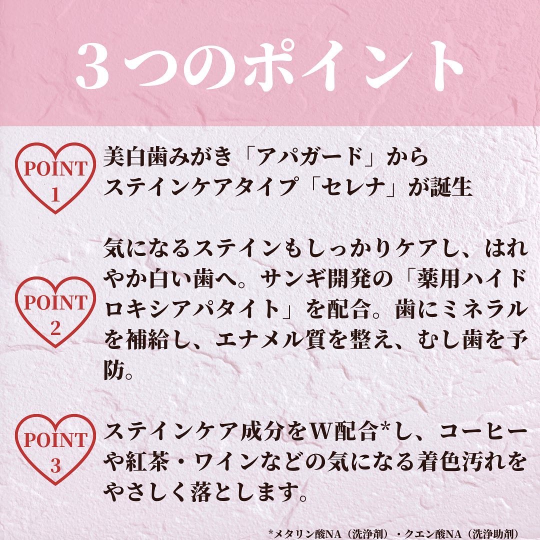 商品提供いただいて使ってみました。アパガードセレナ♡コーヒー、紅茶、ワインなどのステインをしっかりケアしてくれる薬用歯みがきです!サンギ開発のむし歯予防成分「薬用ハイドロキシアパタイト」を配合。歯とほぼ同じ成分(歯のエナメル質の97%はハイド...