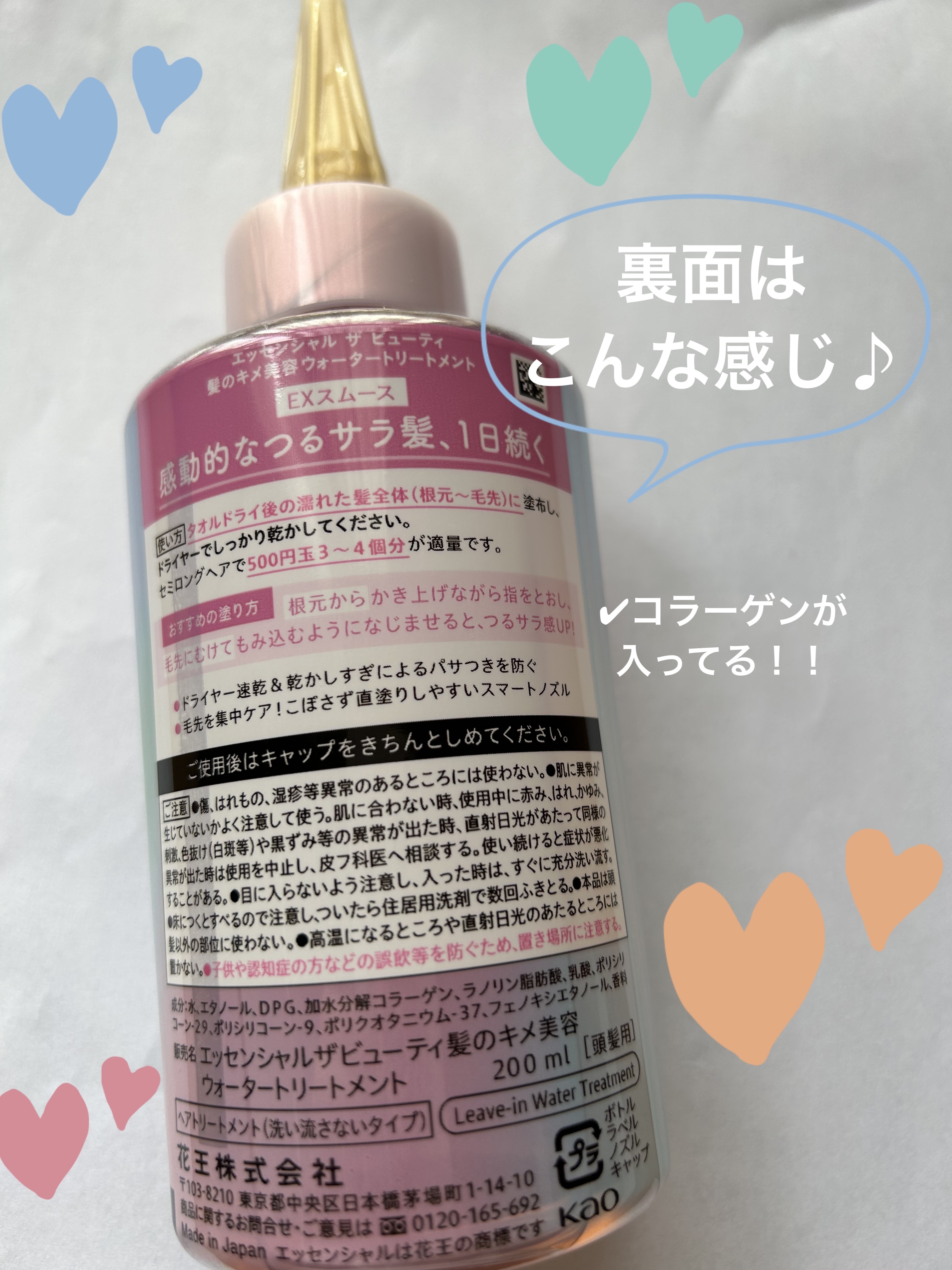 以前アットコスメでサンプルを頂き、気に入りました! 根元から毛先までつけられるのが新鮮です。 水状のトリートメントなので全くベタつきません。 こちらをつけてからドライヤーで乾すと、翌日髪がツヤツヤです!!! 11月下旬に期間限定でシャンプー&トリートメントのサンプル付き(お値段同じ)が発売するそうです。 美容師さんのおすすめ市販シャンプーにエッセンシャル ザ ビューティーが入っていたので、そちらも購入したいです♥️笑 このパッケージも気に入っています🌈🌈 値段もお手頃なので続けやすいと思います!! ミディアムヘアで毎日使ったとして毛量によりますが、1ヶ月半~2ヶ月は使えると思います。