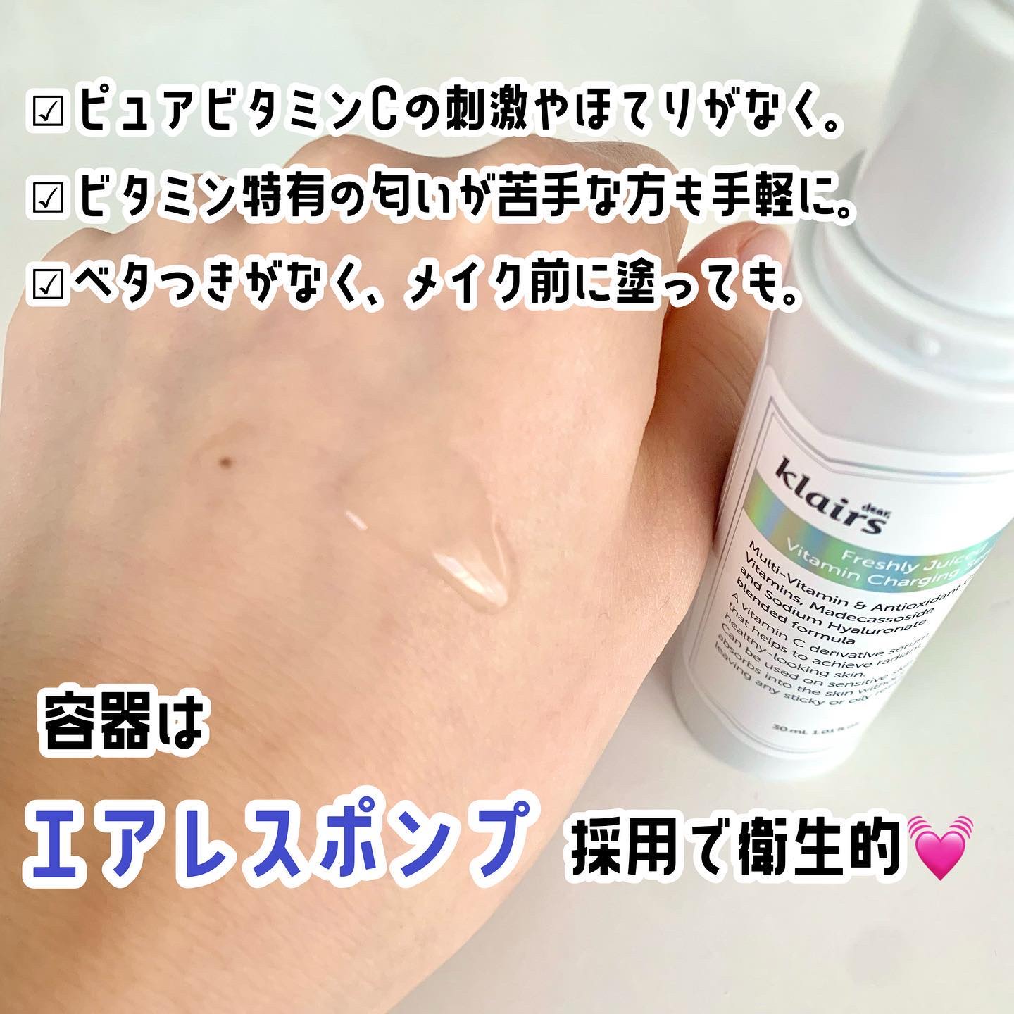 明るくクリアなお肌作りに欠かせないビタミンC🍋 フレッシュリージュースドビタミンチャージングセラムはビタミンC特有のピリピリした熱感やオイリーなベたつき感のない、とにかく軽い使い心地が特徴! 少しとろみがあるみずみずしいゲルテクスチャー。香りもなく、本当にクセがないです︎︎👍 この使い心地大好きです!これで二本目ですが、なくなったらまた買いたい。