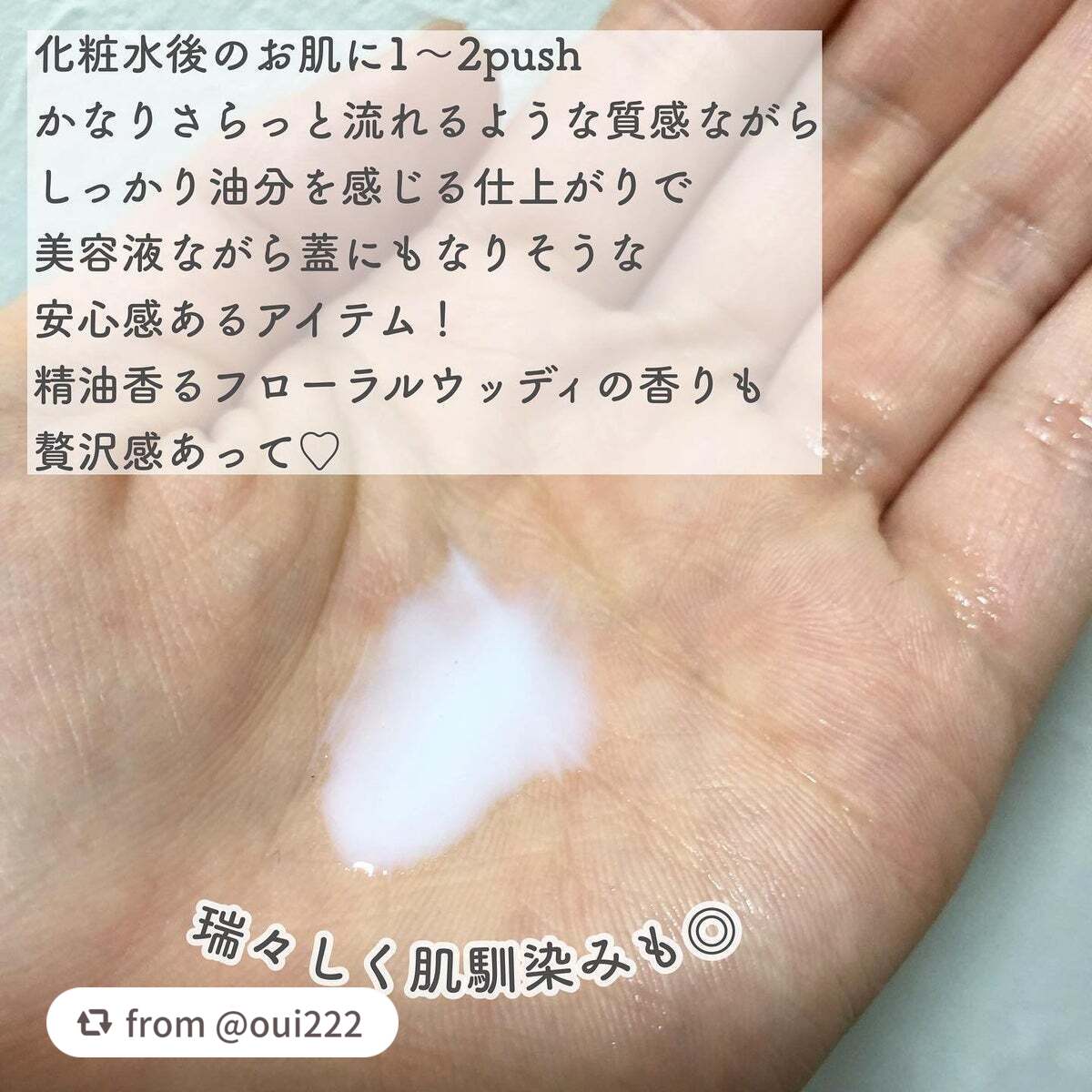 | オイルが入ってるとは感じないくらいベタつき感はなく、さらっと肌に馴染みます。 | 詳細を見る | ||