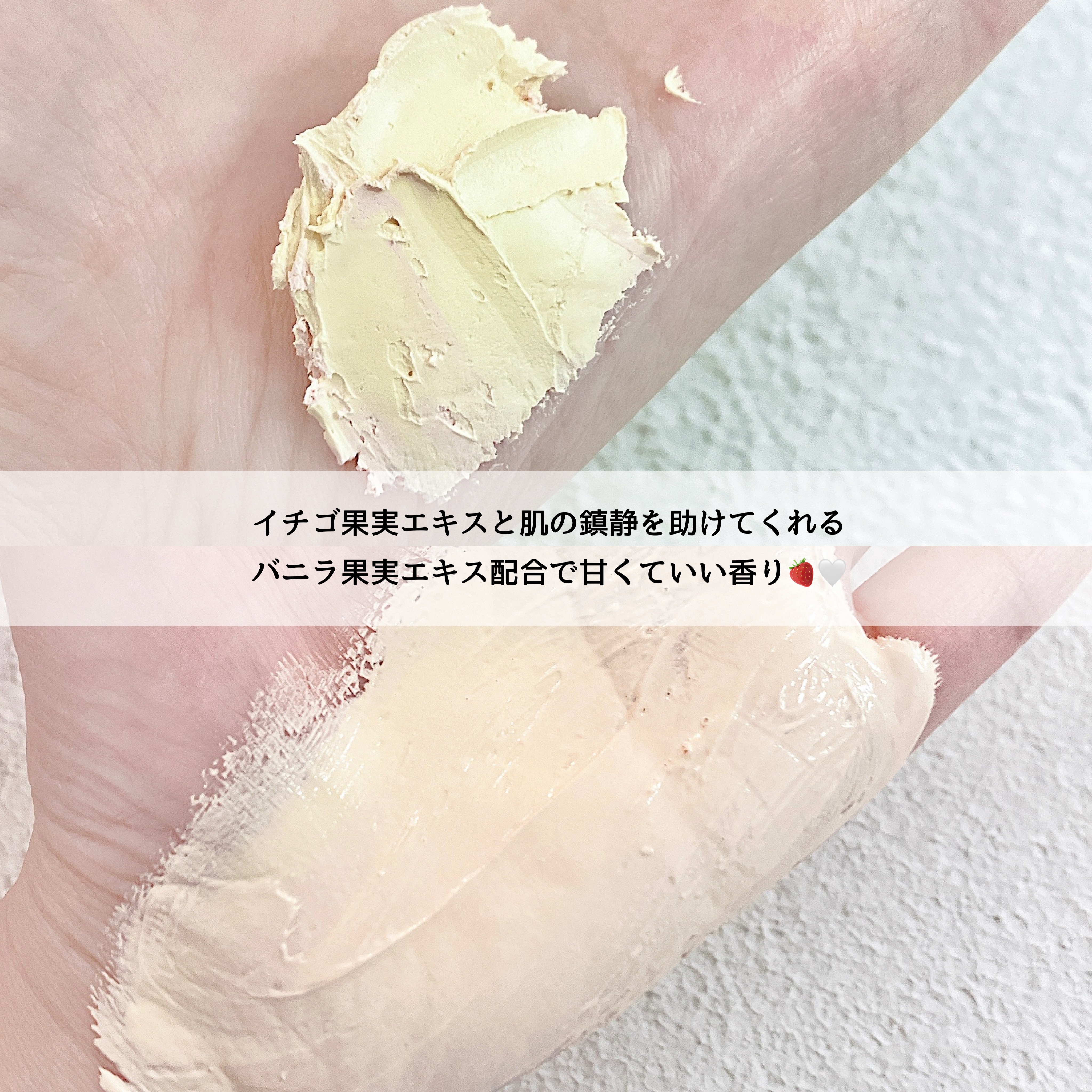 - イチゴバニラの香りのパックにも洗顔にもなる新感覚2in1クレンザーです。 古い角層や汚れによりくすんだ肌をすっきり洗浄し乾燥により刺激を受けた肌を整え、ケアします。 整肌成分のイチゴ果実エキスは肌に明るい印象を与え、バニラ果実エキスはお肌を整えます。 肌のことを考え、人工色素や人工界面活性剤などは使用しておりません。 ●パックとしてご使用の場合 1.洗顔後、付属のスパチュラで適量を取り出し、乾いた顔(目元・口元を除く)全体に満遍なく塗布する。 2.肌へ十分に馴染むよう、1~2分ほど置く。 3.水またはぬるま湯で優しくこすりながら洗い流す。パックが水に濡れると細かい泡に変わるので、顔全体を包むように洗い流す。 ●洗顔としてご使用の場合 1.濡れた手にサクランボ大1個分ほど取り出し泡立てる。 2. 顔全体に円を描くように優しく洗い、水またはぬるま湯で十分に洗い流す。 *メイクを落とすものではありません。