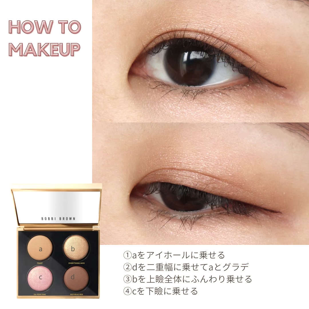 肌馴染みの良いベージュを基調とした配色です。 ラメ・パール・マットの異なる質感の組み合わせ ナチュラルに彩り、立体感のある目元に仕上がります。 保湿成分であるスクワラン・ホホバ種子油を配合 しっとりした柔らかいテクスチャーで高密着。 スウォッチを見ていただければ分かるように、とにかく肌馴染み抜群! 目元に溶け込むような仕上がりです。 ふんわりした質感で目元のアラが見えにくくなりました。 01と02はオレンジ感とピンク感の多少の違いがある程度です。 個人的には左上のラメの質感やカラーがとっても好きです