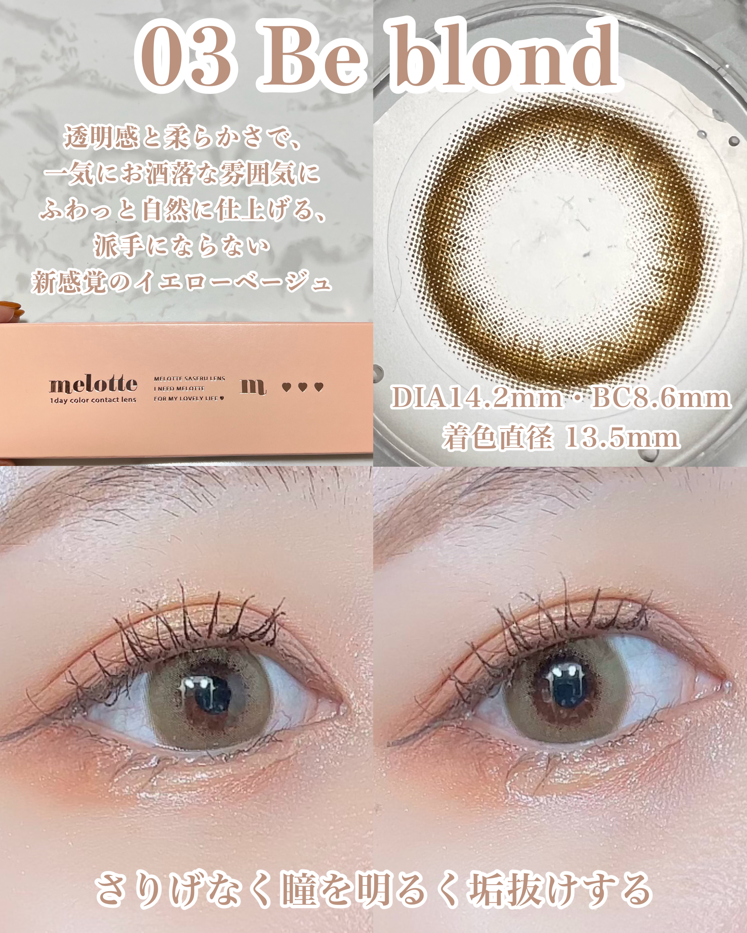 - 時には甘く、時にはオトナに。デザインだけでなく使いやすさにもこだわった、ナチュラルだけどしっかり可愛くなれるラインナップ。 一からこだわってつくった、いろんなメイクやファッションに合わせて楽しめるオトナ女子もつかいやすいナチュラルカラーのレンズデザインです。 毎日使うものだからこそ、レンズスペックまでこだわりました。 〇超薄型レンズ採用 0.06mmの超薄型レンズを採用。負担の少ない使い心地で、快適にお使いいただけます。 ※装用感には個人差があります。 〇日差しもケア UVカット機能 紫外線UV-Aを約50%、UV-Bを約95%、レンズに配合されたUV吸収材でカット。 ※目全体及び目の周辺を完全に覆っているわけではないのでUV防止用眼鏡・サングラスの代用にはなりません。 〇うるおい成分配合 うるおい成分、"MPCポリマー"がレンズをやさしく包み込むので、うるおい長持ち。 〇乾きにくい低含水レンズ 低含水レンズ素材は、水分蒸発量が少ないため、乾きにくいのが特徴。 カラーコンタクトレンズの不適正使用による眼障害の危険性等などがあります。 ●コンタクトレンズは高度管理医療機器です。不十分な洗浄・消毒など不適切なケアや、長時間・交換期間を超えた装用により、アレルギー性結膜炎、角膜感染症、角膜潰瘍等の重篤な眼障害が発生する危険性があります ●ご使用前に取扱説明書を確認してください 使用上の留意事項 ●眼科医院等を受診してからお求めください ●眼に異常を感じたら直ちにレンズ使用を中止し、お近くの眼科等で診察を受けてください ●医師の指示にしたがってご使用ください ●コンタクトレンズを装用する場合、自覚症状がなくても、眼科医院等での定期検査を受けてください ●レンズに不具合がある場合は使用しないでください