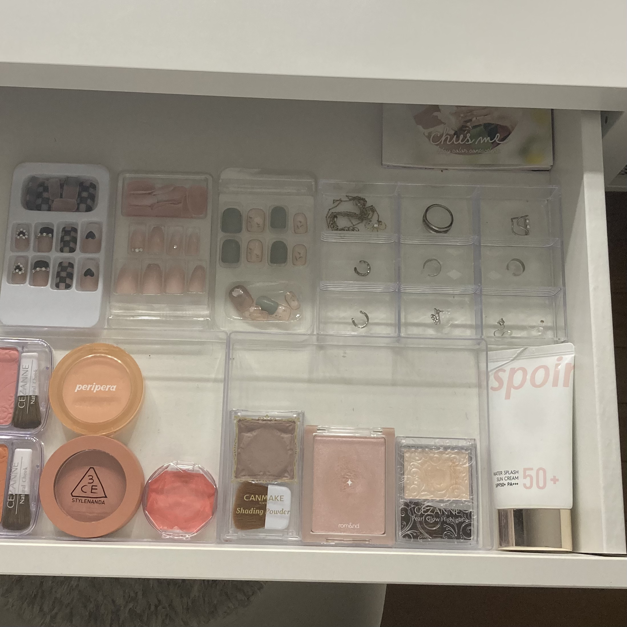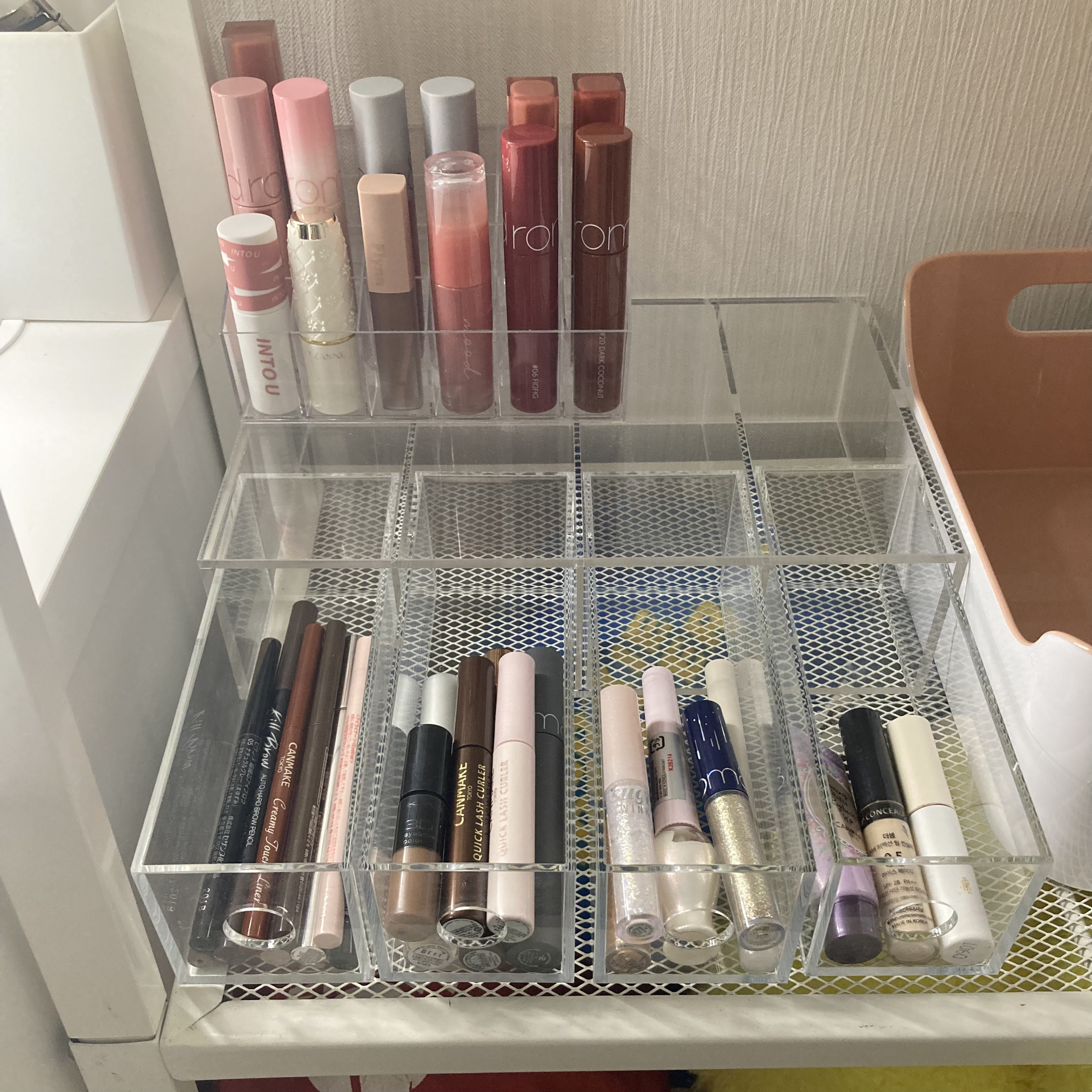 机の棚の二段に分けてコスメを置いてます ✨ 下段にベースメイクやカラコン、リップ、アイライン、小さいパケのアイシャドウ等 上段のは3COINSのクリアドレッサーです !! クリアドレッサーは鏡付きなので持ち運んでどこでもメイクができます !! 本当は下段のスペースがもったいないなと 思っているのでいいのないか探しています 🤔