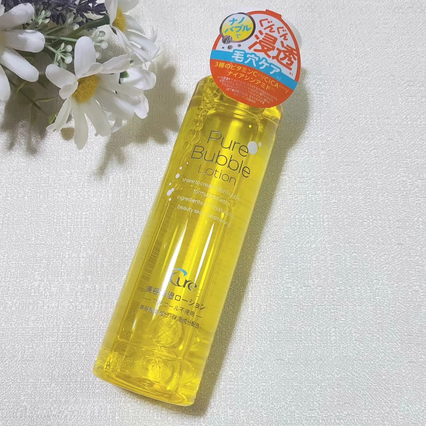 ボトルを振るだけで0.001mm以下の超微細な泡「ナノバブル」を発生させる化粧水 Cure (キュア)【 ピュアバブルローション 】 このナノバブルが美容成分をお肌のすみずみまで届けてくれるとのこと 毛穴の目立ちにくいふっくらと お肌へのやさしさと効果の両立を第一に考え、無香料・無着色・アルコール不使用というところも嬉しいポイントですね