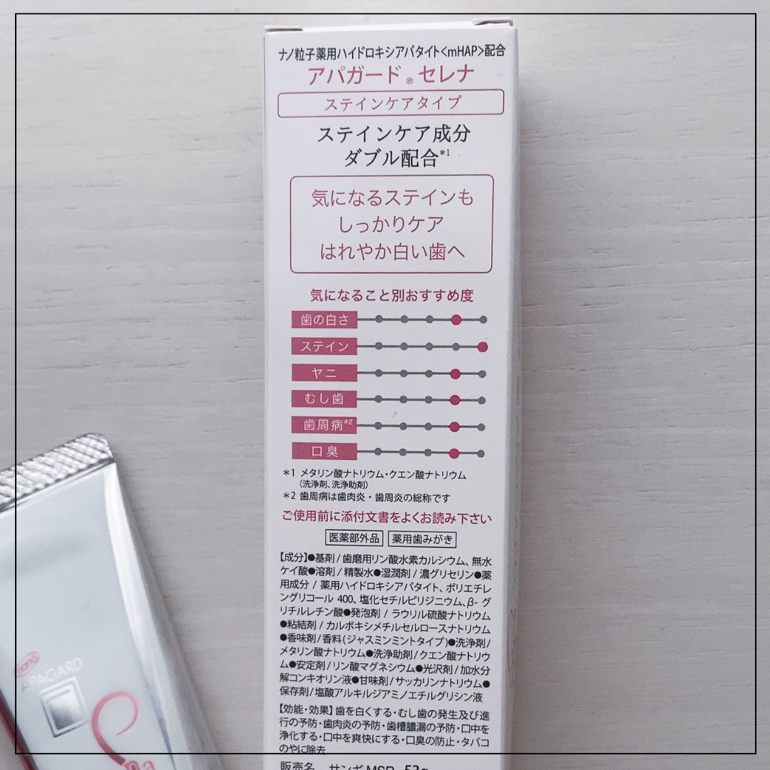 - 【医薬部外品】 美白歯みがき「アパガード」シリーズのステインケアタイプ。サンギ開発のむし歯予防成分「薬用ハイドロキシアパタイト」を配合。歯とほぼ同じ成分(歯のエナメル質の97%はハイドロキシアパタイト)で、エナメル質にアプローチ! さらにステインケア成分をダブル配合*し、コーヒーや紅茶・ワインなどの気になる着色汚れを落とします。 ステインケアではれやか白い歯に。 *メタリン酸ナトリウム(洗浄剤)・クエン酸ナトリウム(洗浄助剤) ●医薬部外品/薬用歯みがき 販売名:サンギMSR