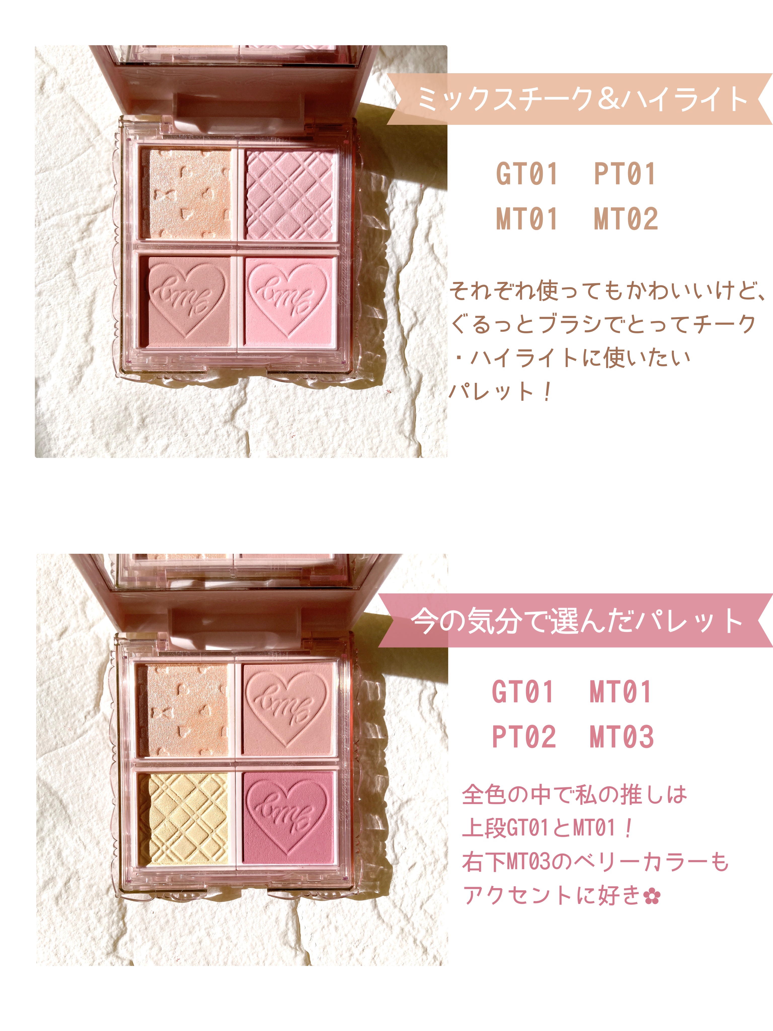 色はあわーーい! 白強めのピンク。 もはやフェイスパウダーとしても使えそうな繊細な粉が、けっこうしっかりめにプレスがされている感じ。 青みピンクってほど青みはなく、黄み感もなさそうなピンクです。 とりあえず、見た目だけでも抜群にかわいくて満足🌸