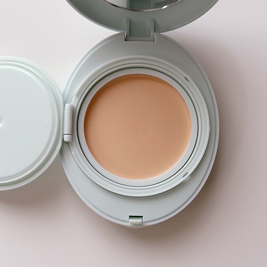 ミラーとしずく型のパフ付きで持ち運びにも便利。メイクの上から使えます😊 もち米由来の自然パウダーとカラーミングパウダーで紫外線で敏感になった肌の熱を落ち着かせてすべすべの仕上がりに。 ジュワッとみずみずしいテクスチャで肌に乗せるとややひんやり感あり。お肌もしっとり、明るく見えて小鼻の際の赤みもカバー✨