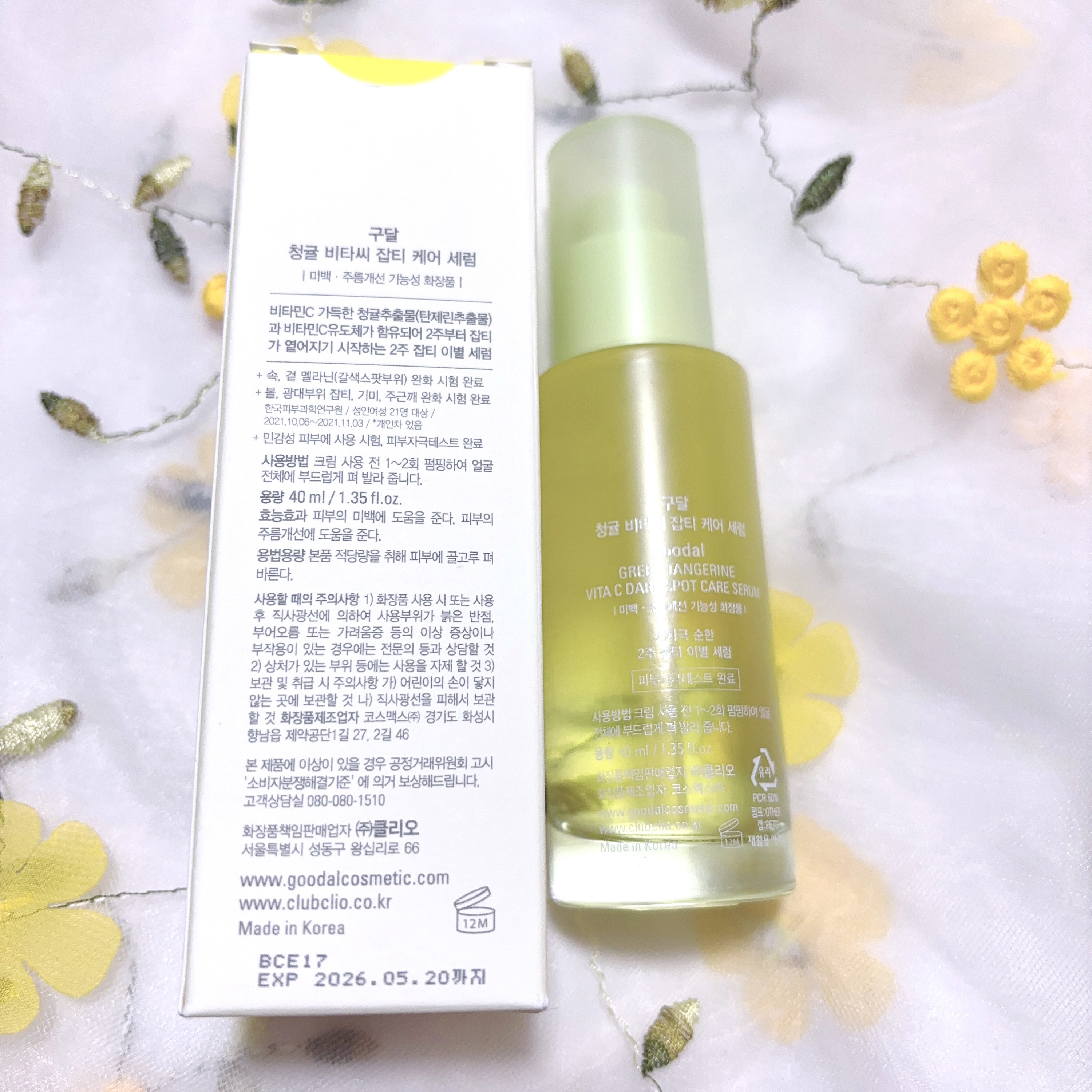 - ◆グーダル グリーンタンジェリンビタCダークスポットケアセラム 40ml 累積販売数:650万個*1 グーダルならではの厳格な基準*2を通過したこだわりの新鮮な済州無農薬青ミカンを直接収穫してAir Bubble Brewing工法で抽出 。生き生きとした印象の肌に。青みかんエキス(タンジェリンエキス)70%配合。乾燥によるくすみをケアし、透明感のある肌に導きます。 お肌のキメを整えるための整肌成分であるビタミンB3(ナイアシンアミド)が既存のグーダルグリーンタンジェリンビタCシミセラムプラスの2倍である4%になりました。 *1:2018.02~2023.09 全チャンネル販売数量基準|リニューアル製品を含む *2:7月中旬から8月中旬の間に獲れたての青ミカンの鮮度を現場ですぐに評価して選別し、超低温で管理、低い温度から直接抽出する青みかんエキス(整肌成分) <酸度>:㏗測定器、リトマス紙使用/酸度3.0~4.0かを確認 <果皮水分含量>:鮮度評価指標で皮の水分含量を測定