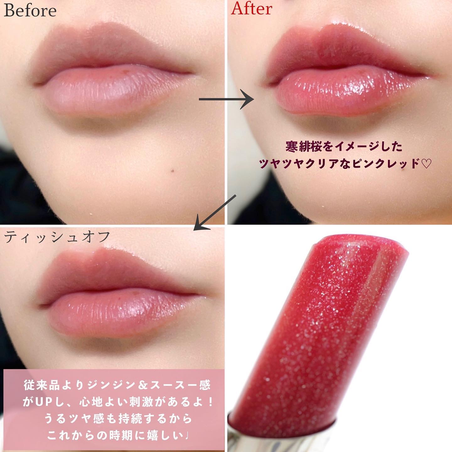 - <PK01 ほんのり桜色> スクワラン、リンゴ酸ジイソステアリル、ダイマージリノール酸(フィトステリル/イソステアリル/セチル/ステアリル/ベヘニル)、イソノナン酸イソトリデシル、トリ(カプリル酸/カプリン酸)グリセリル、トリイソステアリン酸ポリグリセリル-2、(イソステアリン酸ポリグリセリル-2/ダイマージリノール酸)コポリマー、ポリエチレン、水添ポリイソブテン、パラフィン、マイクロクリスタリンワックス、ダイマージリノール酸ジ(イソステアリル/フィトステリル)、オタネニンジン根エキス、ソメイヨシノ葉エキス、パルミトイルトリペプチド-1、ラウロイルグルタミン酸ジ(コレステリル/オクチルドデシル)、BG、水、イソステアリン酸ソルビタン、ジメチコン、トリベヘニン、パルミチン酸エチルヘキシル、BHT、フェノキシエタノール、メチルパラベン、エチルパラベン、プロピルパラベン、ブチルパラベン、酸化チタン、マイカ、赤223、赤226 <PK01> スクワラン、リンゴ酸ジイソステアリル、ダイマージリノール酸(フィトステリル/イソステアリル/セチル/ステアリル/ベヘニル)、イソノナン酸イソトリデシル、トリ(カプリル酸/カプリン酸)グリセリル、トリイソステアリン酸ポリグリセリル-2、(イソステアリン酸ポリグリセリル-2/ダイマージリノール酸)コポリマー、ポリエチレン、水添ポリイソブテン、パラフィン、マイクロクリスタリンワックス、ダイマージリノール酸ジ(イソステアリル/フィトステリル)、オタネニンジン根エキス、ソメイヨシノ葉エキス、パルミトイルトリペプチド-1、ラウロイルグルタミン酸ジ(コレステリル/オクチルドデシル)、BG、水、イソステアリン酸ソルビタン、ジメチコン、トリベヘニン、パルミチン酸エチルヘキシル、BHT、フェノキシエタノール、メチルパラベン、エチルパラベン、プロピルパラベン、ブチルパラベン、酸化チタン、マイカ、赤223、赤226 <RD01 燃ゆる紅桜色(プランパー)> スクワラン、リンゴ酸ジイソステアリル、ダイマージリノール酸(フィトステリル/イソステアリル/セチル/ステアリル/ベヘニル)、イソノナン酸イソトリデシル、トリ(カプリル酸/カプリン酸)グリセリル、トリイソステアリン酸ポリグリセリル-2、(イソステアリン酸ポリグリセリル-2/ダイマージリノール酸)コポリマー、合成ワックス、パラフィン、水添ポリイソブテン、マイクロクリスタリンワックス、ダイマージリノール酸ジ(イソステアリル/フィトステリル)、アテロコラーゲン、コンドロイチン硫酸Na、ソメイヨシノ葉エキス、パルミトイルトリペプチド-1、メントキシプロパンジオール、ラウロイルグルタミン酸ジ(コレステリル/オクチルドデシル)、BG、合成フルオロフロゴパイト、水、乳酸、イソステアリン酸ソルビタン、ジメチコン、テトライソステアリン酸ペンタエリスリチル、トリヒドロキシステアリン、トリベヘニン、パルミチン酸エチルヘキシル、ポリエチレン、バニリルブチル、BHT、トコフェロール、フェノキシエタノール、メチルパラベン、エチルパラベン、プロピルパラベン、ブチルパラベン、酸化スズ、酸化チタン、酸化鉄、赤201、赤202、赤223、橙201、黄4 <PK01 ほんのり桜色 (限定パッケージ)> スクワラン、リンゴ酸ジイソステアリル、ダイマージリノール酸(フィトステリル/イソステアリル/セチル/ステアリル/ベヘニル)、イソノナン酸イソトリデシル、トリ(カプリル酸/カプリン酸)グリセリル、トリイソステアリン酸ポリグリセリル-2、(イソステアリン酸ポリグリセリル-2/ダイマージリノール酸)コポリマー、ポリエチレン、水添ポリイソブテン、パラフィン、マイクロクリスタリンワックス、ダイマージリノール酸ジ(イソステアリル/フィトステリル)、オタネニンジン根エキス、ソメイヨシノ葉エキス、パルミトイルトリペプチド-1、ラウロイルグルタミン酸ジ(コレステリル/オクチルドデシル)、BG、水、イソステアリン酸ソルビタン、ジメチコン、トリベヘニン、パルミチン酸エチルヘキシル、BHT、フェノキシエタノール、メチルパラベン、エチルパラベン、プロピルパラベン、ブチルパラベン、酸化チタン、マイカ、赤223、赤226 <PK01> スクワラン、リンゴ酸ジイソステアリル、ダイマージリノール酸(フィトステリル/イソステアリル/セチル/ステアリル/ベヘニル)、イソノナン酸イソトリデシル、トリ(カプリル酸/カプリン酸)グリセリル、トリイソステアリン酸ポリグリセリル-2、(イソステアリン酸ポリグリセリル-2/ダイマージリノール酸)コポリマー、ポリエチレン、水添ポリイソブテン、パラフィン、マイクロクリスタリンワックス、ダイマージリノール酸ジ(イソステアリル/フィトステリル)、オタネニンジン根エキス、ソメイヨシノ葉エキス、パルミトイルトリペプチド-1、ラウロイルグルタミン酸ジ(コレステリル/オクチルドデシル)、BG、水、イソステアリン酸ソルビタン、ジメチコン、トリベヘニン、パルミチン酸エチルヘキシル、BHT、フェノキシエタノール、メチルパラ