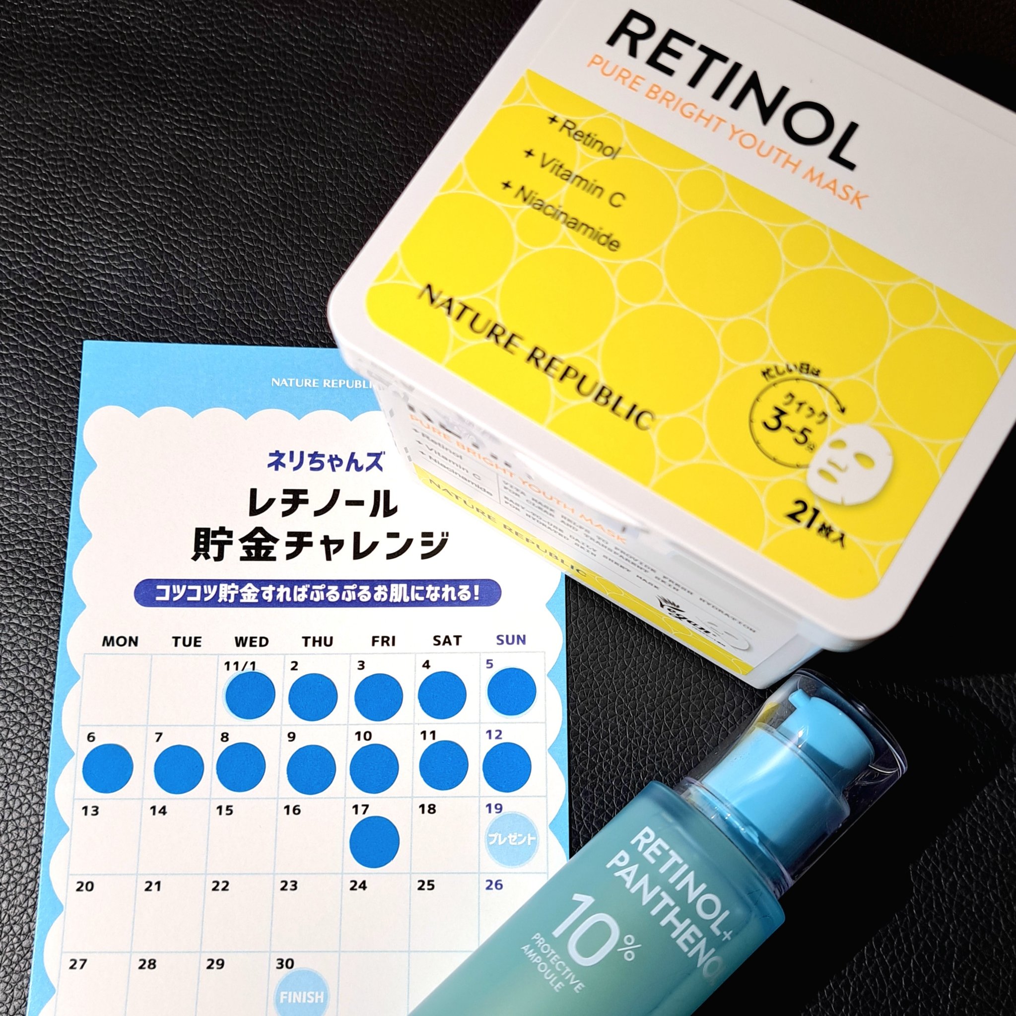 ネイチャーリパブリックのキューブマスク🟨・レチノールピュアブライトユースシートマスクヴィーガンのシートマスクにウォータータイプの美容液がヒタヒタに染み込んでいて、角質層のすみずみまでぐんぐん浸透💛くすんだお肌もワントーンアップしました✨レチノ...