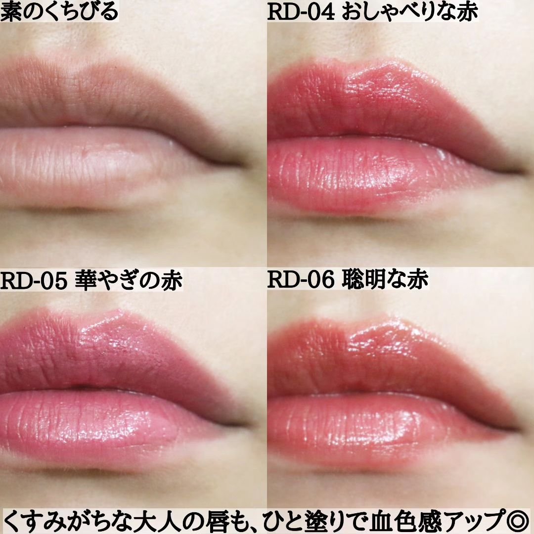 - ひと塗りで、うるおい満ちる血色感。 透け感のある赤が、表情まで明るくつややかに。 1. 美しい発色 赤顔料に加えて「血色パール」を配合することでより赤が美しく発色する。 2. 透明感と軽やかさ 血色パールにより、顔料を多く配合しなくても赤がきれいに洗わせるので、油剤のツヤ感効果も出て、透明感のある仕上がりに。 3. 優しい血色感が続く 唇を優しく色づける染料と色残りの良い板状の「血色パール」で経時でも蛍光色にならず、優しい血色感が続く。