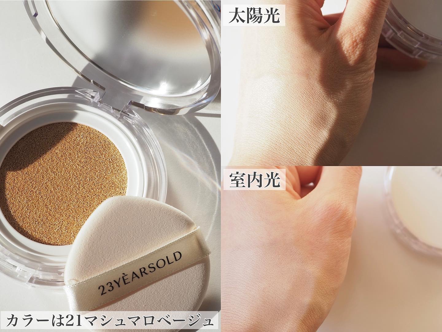 - <21 マシュマロベージュ> 水、シクロペンタシロキサン、酸化チタン、メトキシケイヒ酸エチルヘキシル、サリチル酸オクチル、BG、メチルトリメチコン、イソドデカン、ナイアシンアミ ド、ラウリルポリグリセリル-3ポリジメチルシロキシエチルジメチコン、サ リチル酸ブチルオクチル、オクトクリレン、酸化亜鉛、ポリリシノレイン酸ポリ グリセリル-3、トリメチルシロキシケイ酸、ドクダミエキス、硫酸Mg、ポリ グリセリル-3ポリジメチルシロキシエチルジメチコン、クオタニウム-90ベ ントナイト、(カプリル酸/カプリン酸)グリセリズ、シリカ、ポリメチルシルセ スキオキサン、(アクリレーツ/メタクリル酸ポリトリメチルシロキシ)コポリ マー、(トリメチルシロキシケイ酸/ジメチコノール)クロスポリマー、水酸化A 1、トリエトキシカプリリルシラン、リシノレイン酸ポリグリセリル-3, ステ アリン酸、アデノシン、プルラン、フルクトオリゴ糖、1,2-ヘキサンジオール、グリセリン、チャ葉エキス、トリ(カプリル/カプリン酸)グリセリル、ẞーグ ルカン、マルトデキストリン、コラーゲン、水添レシチン、レウコノストック/ダ イコン根発酵液、マスチック樹脂、ヒアルロン酸Na、ユビキノン、ティーツリ ーエキス、マデカッソシド、アシアチコシド、マデカシン酸、アシアチン酸、酸化 チタン (CI 77891)、CI 77492、CI 77491、CI 77499 <23 バターベージュ> 水、シクロペンタシロキサン、酸化チタン、メトキシケイヒ酸エチルヘキシル、サリチル酸オクチル、BG、メチルトリメチコン、イソドデカン、ナイアシンアミ ド、ラウリルポリグリセリル-3ポリジメチルシロキシエチルジメチコン、サ リチル酸ブチルオクチル、オクトクリレン、酸化亜鉛、ポリリシノレイン酸ポリ グリセリル-3、トリメチルシロキシケイ酸、ドクダミエキス、硫酸Mg、ポリ グリセリル-3ポリジメチルシロキシエチルジメチコン、クオタニウム-90ベ ントナイト、(カプリル酸/カプリン酸)グリセリズ、シリカ、ポリメチルシルセ スキオキサン、(アクリレーツ/メタクリル酸ポリトリメチルシロキシ)コポリ マー、(トリメチルシロキシケイ酸/ジメチコノール)クロスポリマー、水酸化A 1、トリエトキシカプリリルシラン、リシノレイン酸ポリグリセリル-3, ステ アリン酸、アデノシン、プルラン、フルクトオリゴ糖、1,2-ヘキサンジオール、グリセリン、チャ葉エキス、トリ(カプリル/カプリン酸)グリセリル、ẞーグ ルカン、マルトデキストリン、コラーゲン、水添レシチン、レウコノストック/ダ イコン根発酵液、マスチック樹脂、ヒアルロン酸Na、ユビキノン、ティーツリ ーエキス、マデカッソシド、アシアチコシド、マデカシン酸、アシアチン酸、酸化 チタン (CI 77891)、CI 77492、CI 77491、CI 77499