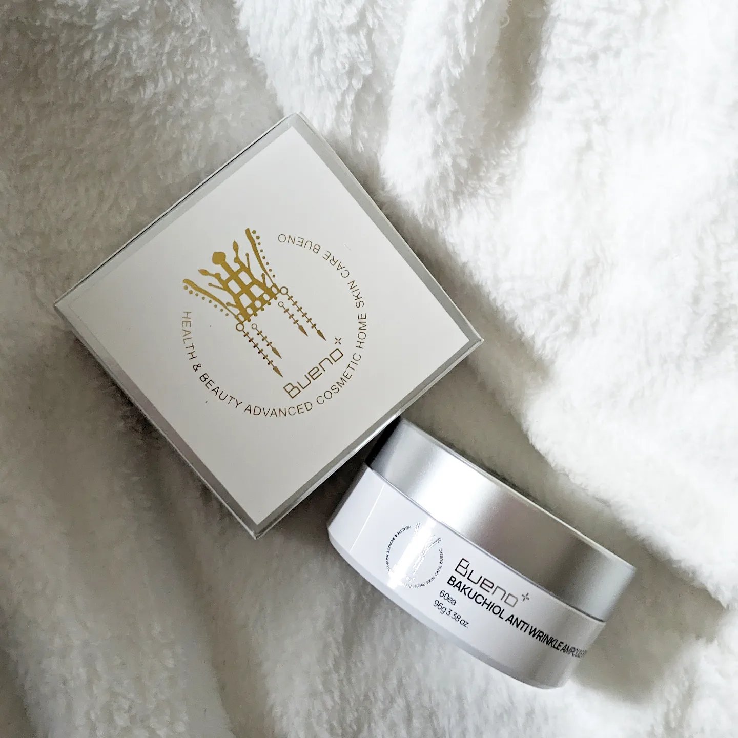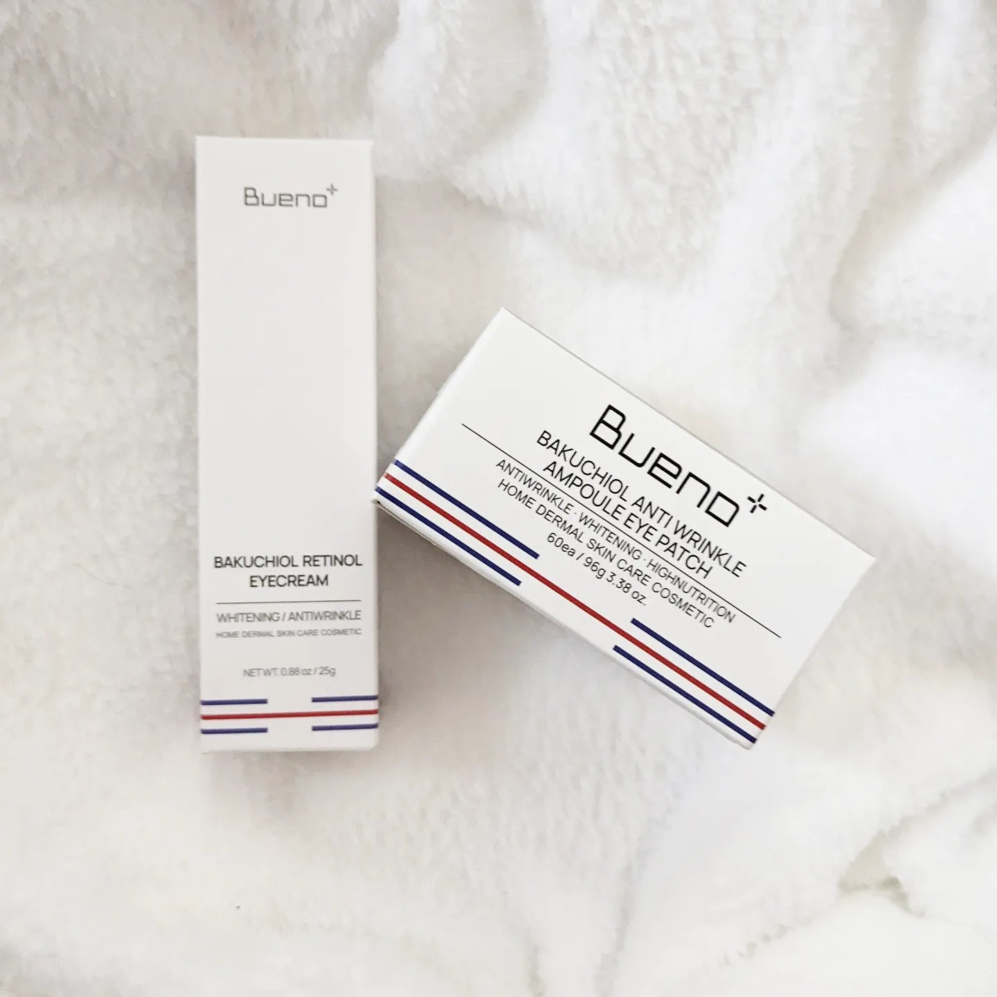 ブエノメディテック独自の黄金比で、高含量バクチオールと高濃度純粋レチノールを配合。 7つの天然植物抽出物が含まれ、肌トラブルの予防、バリア機能を強化。 敏感肌にも使いやすい、優しい処方となっています☺️✨ 抗酸化効果の認められる特許成である、NaturalTSCやアデノシン、ビタミンC、a-Melightも配合。 水分ハイドロゲルに高含量の、有効成分ハイドロビーズが入っており、高密着で肌に水分を届けます。 アイクリームのテクスチャーは、サラッと滑らかで少量でも伸びがいい。すっと肌に馴染みます。 アイパッチの美容液は、とろみがすごい❗️糸引くくらい。 シートが面白い感触で、ぷにぷにぷるんぷるんして、丈夫な寒天みたいで楽しかった😆 肌に乗せると確かに高密着でした♡