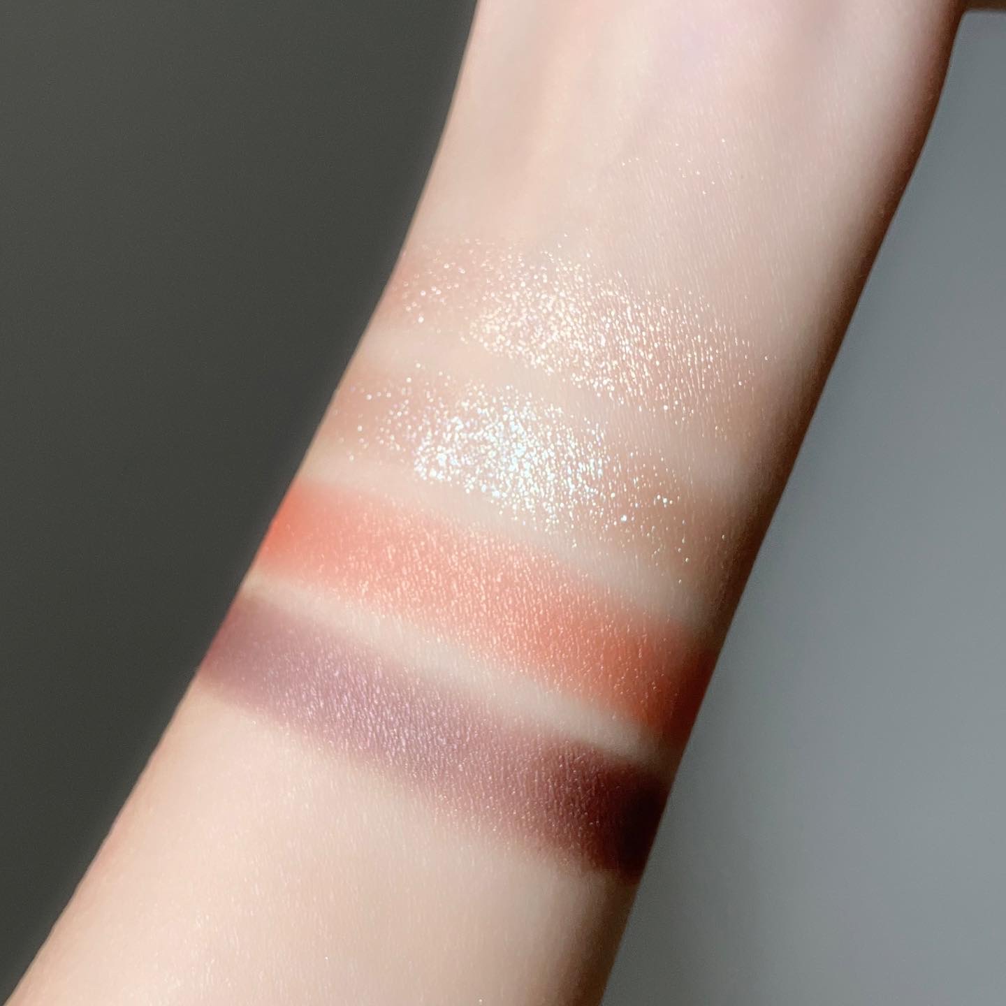 開いた瞬間可愛すぎて思わず声が出たくらいヤバいです。 左上の淡いパールピンクは繊細かつ透明感の塊のピンクパールがぶわぁっと煌めきます。 ゴールド×シルバーでシャンパンゴールドみたいな感じの色合いです🥂