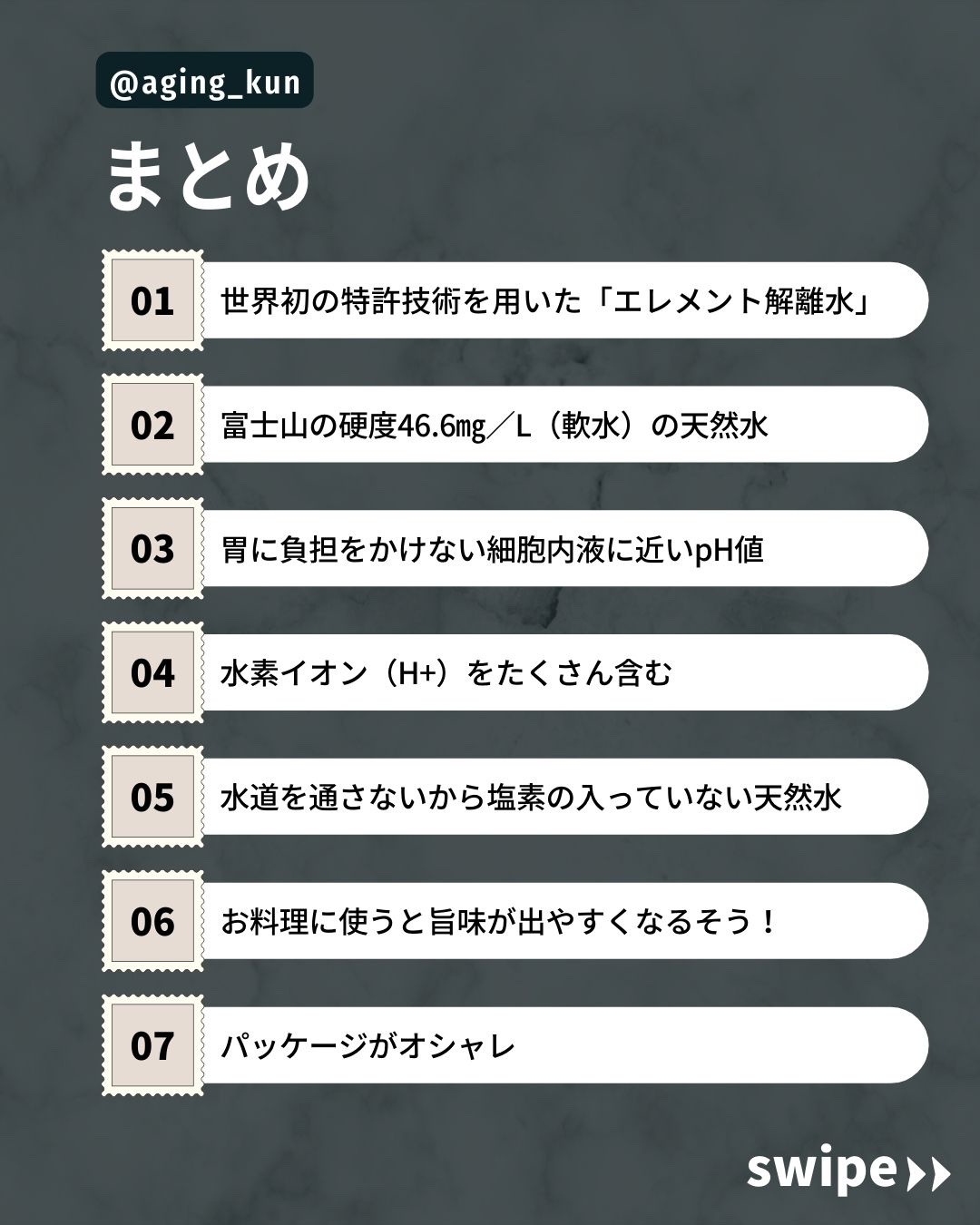 このボトルウォーターは、、、シリカとバナジウムを豊富に含む、富士山の第一不透明水槽(岩盤)の中を流れる硬度46.6㎎/L(軟水)の天然水を使用したすみやかに細胞に浸透する進化したこれまでにない世界初の特許取得をされたお水。 「エレメント解離水」には、美容や健康維持に嬉しいシリカやマグネシウム、カルシウム、カリウムが含まれているよ😉 500mlで硬度29mg程の中性の軟水で常温でも冷やしても美味しく飲めるよ。 巷で話題のシリカが含有されていているのも嬉しいポイント。 水分補給で体内の老廃物を出すことは健康維持にも大切だよね。