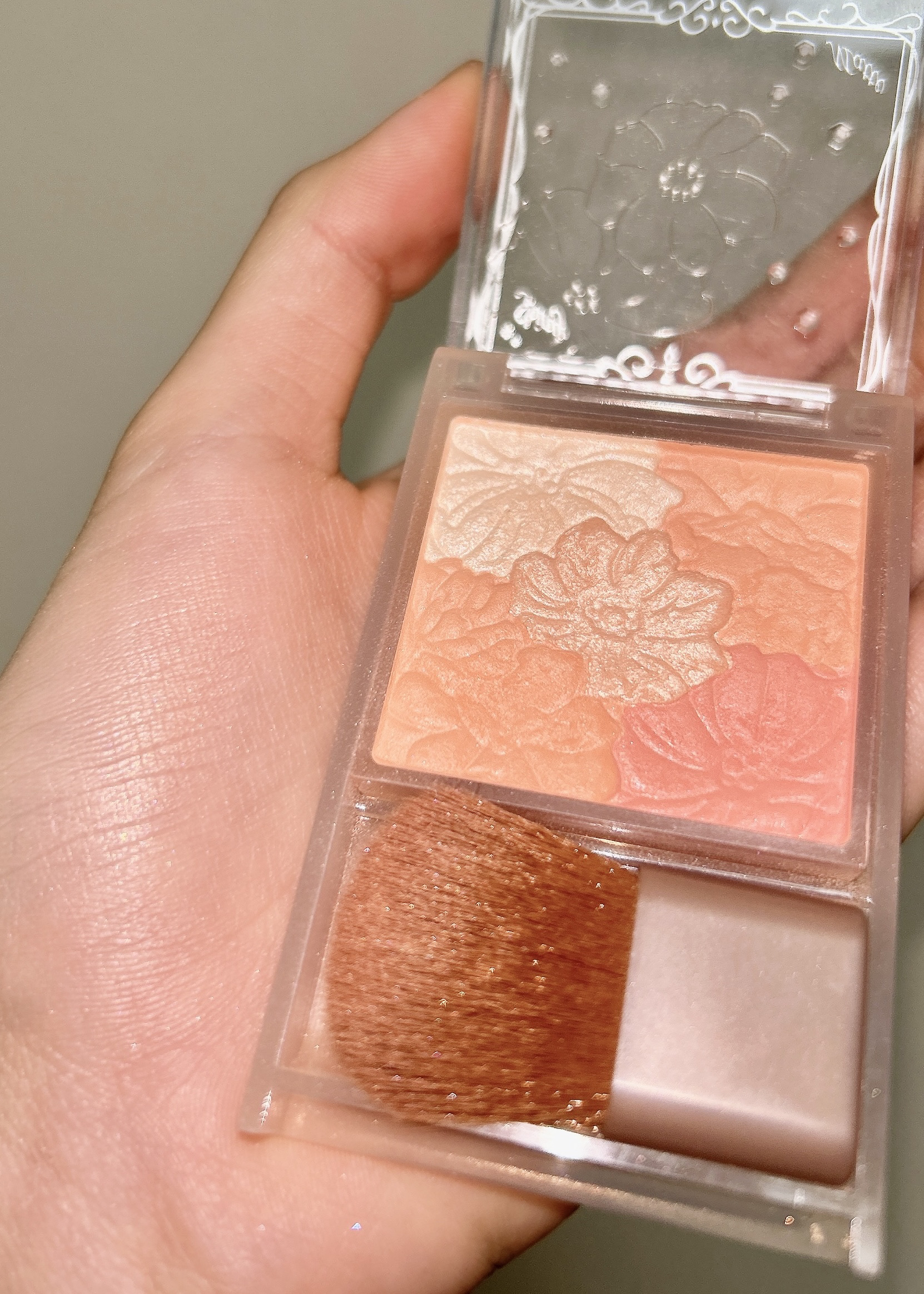 - ”発光ツヤ×透けマット”が1つに 混ぜ方次第で自分好みの仕上がりを作れる4色チーク 透け感のあるマットと繊細パール、2つの質感をブレンドして 肌に溶け込むような透けツヤ発色を楽しめるチーク。 しっとりなめらかなパウダーで、粉飛びしにくく、肌に密着します