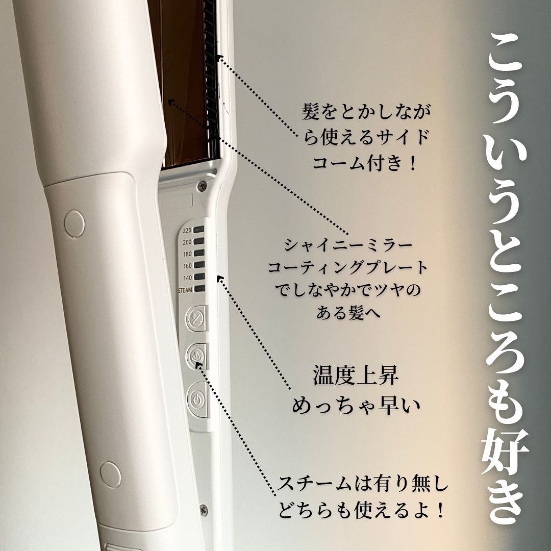 自分の好みで5段階から選べる髪の毛にかかるテンション(上下プレートの間隔)と80℃、100℃、120℃、140℃、160℃、180℃、200℃の7段階から選べる温度調節機能はとっても魅力的なポイントです😄💗✨ 本体の立ち上がりが速くヘアセットを急いでいる時でもサクッと使用できてありがたいです😉💓 何度してみても感動の使い心地でお家でヘアサロン級のセットを叶えてくれるからもう手放す事ができない私の相棒ちゃんです😘✨