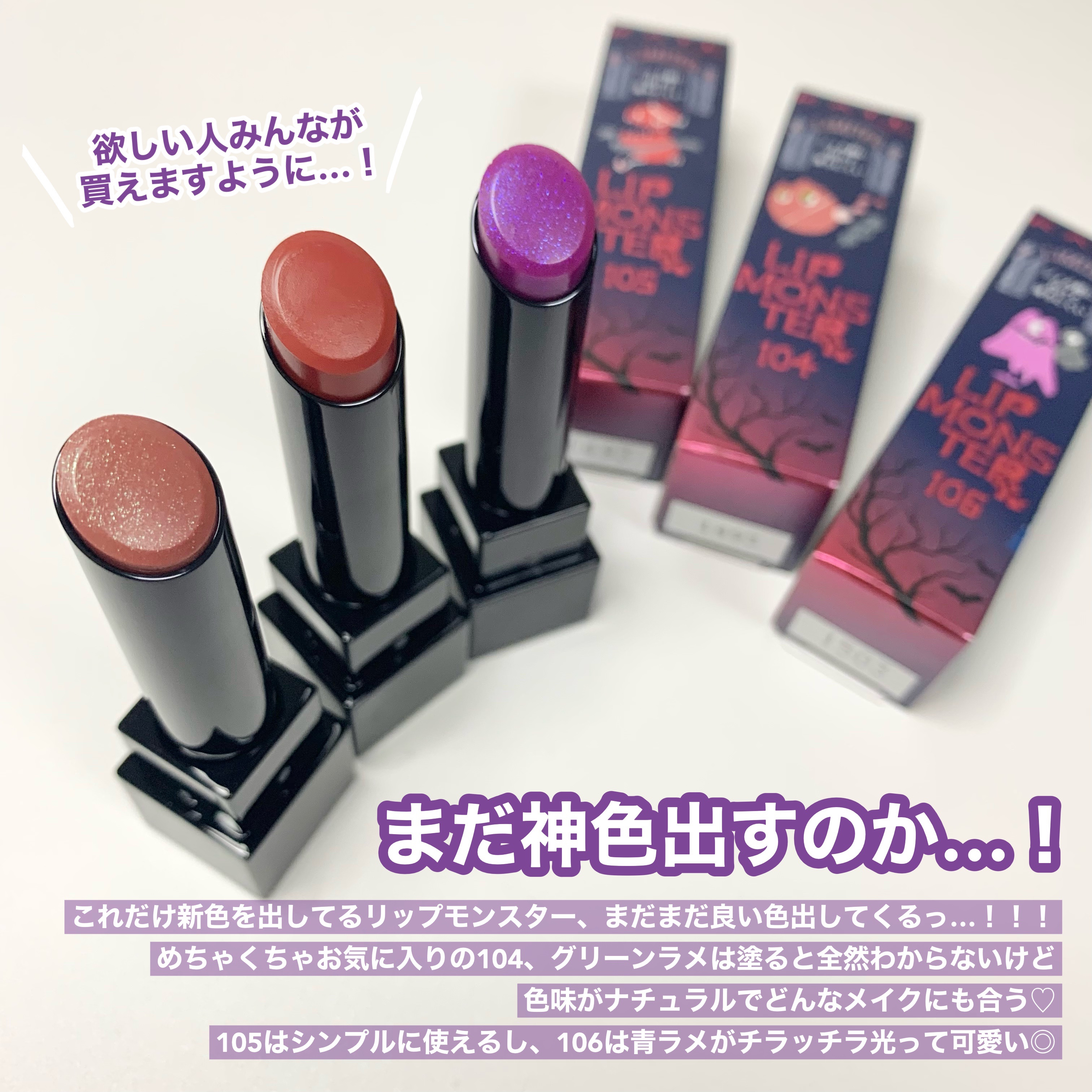 - 落ちにくさも美発色もよくばりたい、つけたての色が長時間持続する人気の口紅リップモンスター。 唇から蒸発する水分を活用して密着ジェル膜に変化する独自技術※で、つけたての色が長時間持続。 高発色&保湿。 ※当社独自の色持ち技術 ■花火のようにまぶしくきらめく 繊細なラメが際立つ限定色 EX-6 ピンクカラー×青ラメ【ロケット花火流星群】 EX-7 オレンジカラー×黄&緑ラメ【100万発の線香花火】 EX-8 レッドカラー×緑ラメ【打ち上げ花火ブランコ】 ■深みレッド系カラーの限定色 EX-9 戦慄の喜笑 (限定色) EX-10 狂気の怒号 (限定色) 【2025クリスマスコフレ】 落ちにくいリップモンスターから、唇の血色感を底上げする ホリデーシーズン限定の熱感ニュアンスベージュ系カラー登場。 EX-11 紅煙宿る贈り物(限定色):ボルドーベージュ系 EX-12 盗まれた1224mの星光(限定色):キャメルベージュ系