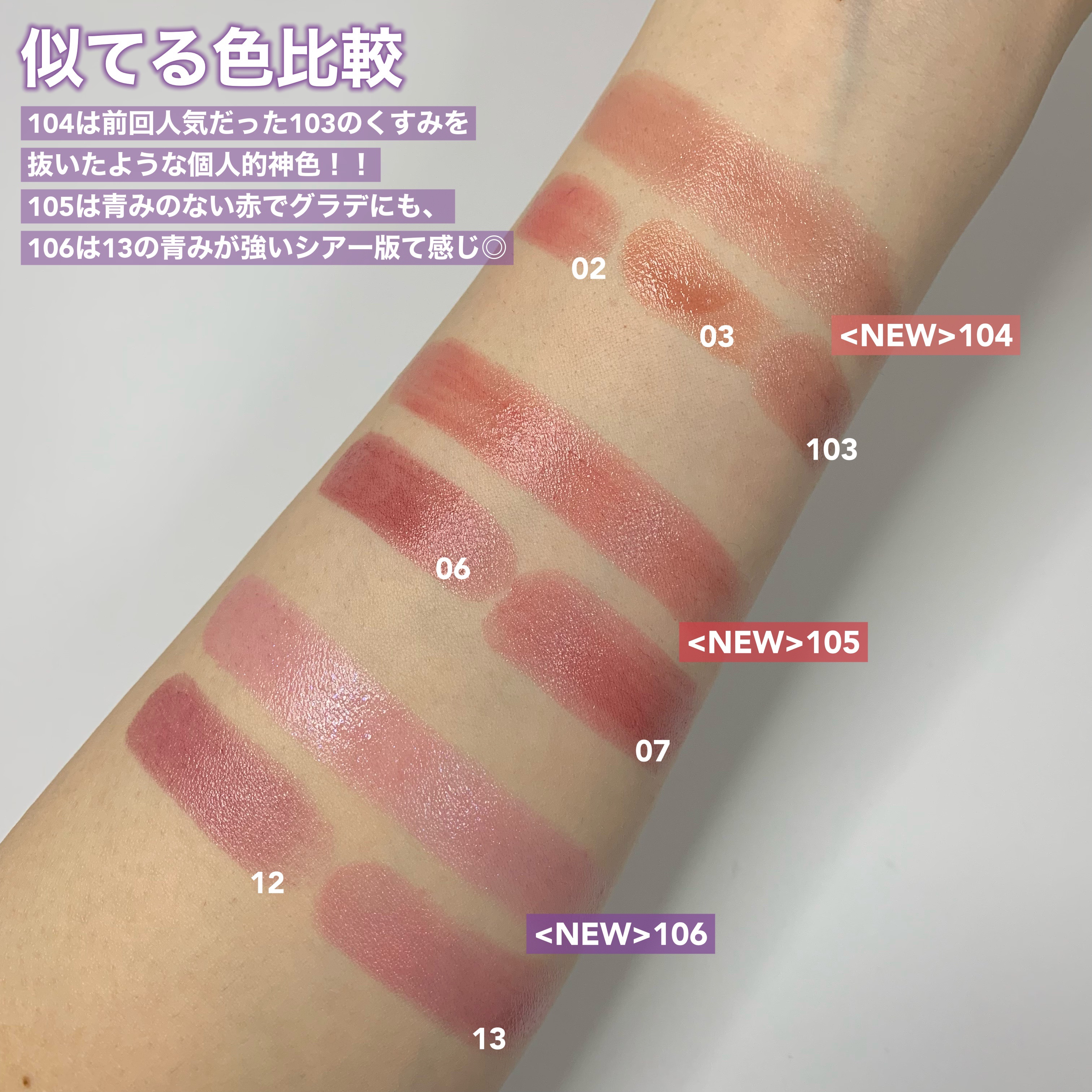 - <01 欲望の塊> テトライソステアリン酸ジペンタエリスリチル、トリ(カプリル酸/カプリン酸)グリセリル、オクチルドデカノール、ラウロイルグルタミン酸ジ(フィトステリル/オクチルドデシル)、ビスアルキル(C16-18)グリセリルウンデシルジメチコン、イソノナン酸イソトリデシル、水添ポリイソブテン、ラウロイルグルタミン酸ジ(オクチルドデシル/フィトステリル/ベヘニル)、パラフィン、合成ワックス、ダイマージリノール酸(フィトステリル/イソステアリル/セチル/ステアリル/ベヘニル)、マイクロクリスタリンワックス、水添マイクロクリスタリンワックス、ヒドロキシステアリン酸エチルヘキシル、トコフェロール、ホホバ種子油、オリーブ果実油、アーモンド油、(エチレン/プロピレン)コポリマー、ポリエチレン、ジメチコン、(+/-)(チタン/酸化チタン)焼結物、マイカ、ラウロイルアスパラギン酸Na、ラウロイルリシン、塩化亜鉛、酸化チタン、酸化鉄、水酸化Al、硫酸Ba、トリイソステアリン酸イソプロピルチタン、酸化スズ、ホウケイ酸(Ca/Al)、合成フルオロフロゴパイト、黄4、黄5、赤104(1)、赤201、赤202 <02 ピンクバナナ> テトライソステアリン酸ジペンタエリスリチル、トリ(カプリル酸/カプリン酸)グリセリル、オクチルドデカノール、ラウロイルグルタミン酸ジ(フィトステリル/オクチルドデシル)、ビスアルキル(C16-18)グリセリルウンデシルジメチコン、イソノナン酸イソトリデシル、水添ポリイソブテン、ラウロイルグルタミン酸ジ(オクチルドデシル/フィトステリル/ベヘニル)、パラフィン、合成ワックス、ダイマージリノール酸(フィトステリル/イソステアリル/セチル/ステアリル/ベヘニル)、マイクロクリスタリンワックス、水添マイクロクリスタリンワックス、ヒドロキシステアリン酸エチルヘキシル、トコフェロール、ホホバ種子油、オリーブ果実油、アーモンド油、(エチレン/プロピレン)コポリマー、ポリエチレン、ジメチコン、(+/-)(チタン/酸化チタン)焼結物、マイカ、ラウロイルアスパラギン酸Na、ラウロイルリシン、塩化亜鉛、酸化チタン、酸化鉄、水酸化Al、硫酸Ba、トリイソステアリン酸イソプロピルチタン、酸化スズ、ホウケイ酸(Ca/Al)、合成フルオロフロゴパイト、黄4、黄5、赤104(1)、赤201、赤202 <03 陽炎> テトライソステアリン酸ジペンタエリスリチル、トリ(カプリル酸/カプリン酸)グリセリル、オクチルドデカノール、ラウロイルグルタミン酸ジ(フィトステリル/オクチルドデシル)、ビスアルキル(C16-18)グリセリルウンデシルジメチコン、イソノナン酸イソトリデシル、水添ポリイソブテン、ラウロイルグルタミン酸ジ(オクチルドデシル/フィトステリル/ベヘニル)、パラフィン、合成ワックス、ダイマージリノール酸(フィトステリル/イソステアリル/セチル/ステアリル/ベヘニル)、マイクロクリスタリンワックス、水添マイクロクリスタリンワックス、ヒドロキシステアリン酸エチルヘキシル、トコフェロール、ホホバ種子油、オリーブ果実油、アーモンド油、(エチレン/プロピレン)コポリマー、ポリエチレン、ジメチコン、(+/-)(チタン/酸化チタン)焼結物、マイカ、ラウロイルアスパラギン酸Na、ラウロイルリシン、塩化亜鉛、酸化チタン、酸化鉄、水酸化Al、硫酸Ba、トリイソステアリン酸イソプロピルチタン、酸化スズ、ホウケイ酸(Ca/Al)、合成フルオロフロゴパイト、黄4、黄5、赤104(1)、赤201、赤202 <04 パンプキンワイン> テトライソステアリン酸ジペンタエリスリチル、トリ(カプリル酸/カプリン酸)グリセリル、オクチルドデカノール、ラウロイルグルタミン酸ジ(フィトステリル/オクチルドデシル)、ビスアルキル(C16-18)グリセリルウンデシルジメチコン、イソノナン酸イソトリデシル、水添ポリイソブテン、ラウロイルグルタミン酸ジ(オクチルドデシル/フィトステリル/ベヘニル)、パラフィン、合成ワックス、ダイマージリノール酸(フィトステリル/イソステアリル/セチル/ステアリル/ベヘニル)、マイクロクリスタリンワックス、水添マイクロクリスタリンワックス、ヒドロキシステアリン酸エチルヘキシル、トコフェロール、ホホバ種子油、オリーブ果実油、アーモンド油、(エチレン/プロピレン)コポリマー、ポリエチレン、ジメチコン、(+/-)(チタン/酸化チタン)焼結物、マイカ、ラウロイルアスパラギン酸Na、ラウロイルリシン、塩化亜鉛、酸化チタン、酸化鉄、水酸化Al、硫酸Ba、トリイソステアリン酸イソプロピルチタン、酸化スズ、ホウケイ酸(Ca/Al)、合成フルオロフロゴパイト、黄4、黄5、赤104(1)、赤201、赤202 <05 ダークフィグ> テトライソステアリン酸ジペンタエリスリチル、トリ(カプリル酸/カプリン酸)グリセリル、オクチルドデカノール、ラウロイルグルタミン酸ジ(フィトステリル/オクチルドデシル)、ビスアルキル(C16-18)グリセリルウンデシルジメチコン、イソノナン酸イソトリデシル、水添ポリイソブテン、ラウロイルグルタミン酸ジ(オクチルドデシル/フィトステリル/ベヘニル)、
