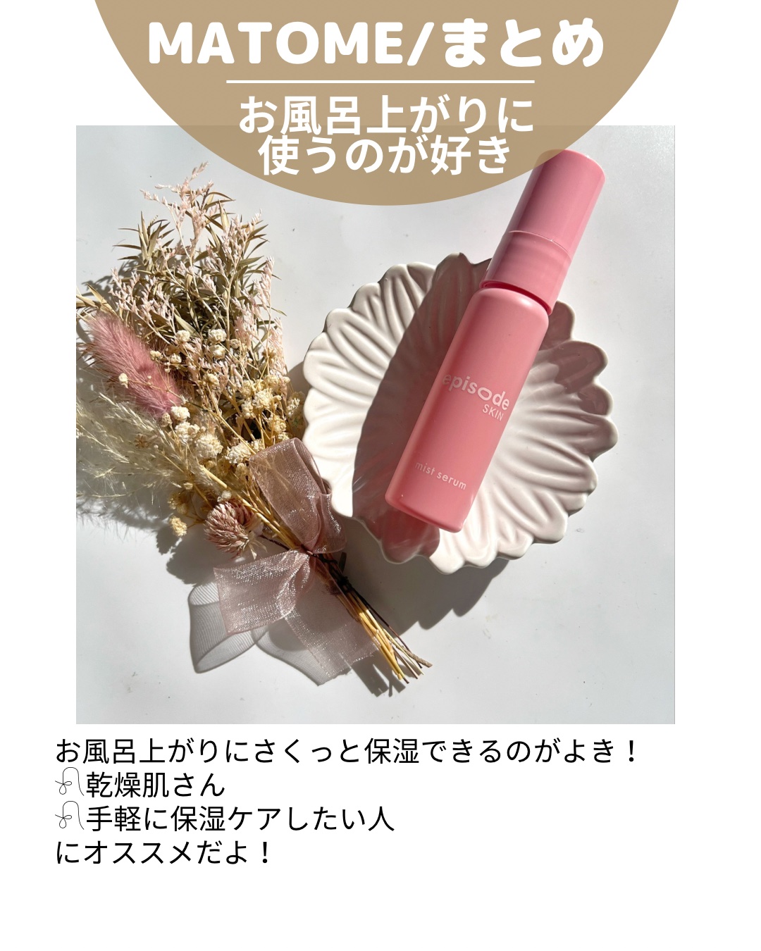 - 須田アンナとYURINOがプロデュースするスキンケアブランド「episode SKIN/エピソードスキン」から第一弾として”ミストセラム”を発売! 様々な肌悩みの原因である乾燥からお肌を守る「保湿」ケアがいつでもどこでも簡単時短にできるミストタイプの美容液です。成分へのこだわりはもちろんのこと、どこにでも持ち歩きたくなるようなお洒落なパッケージにデザインしました。