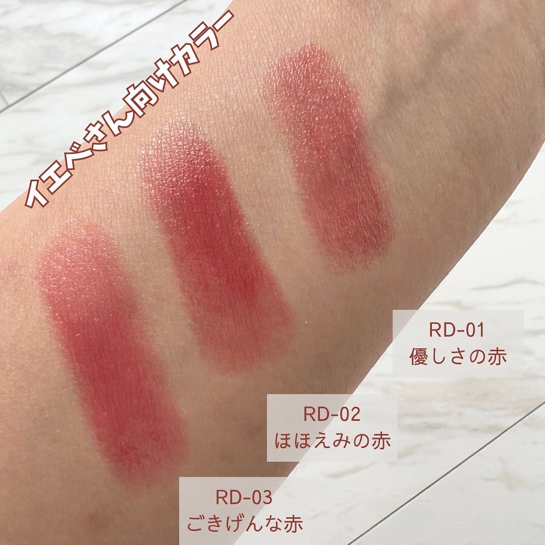 - ひと塗りで、うるおい満ちる血色感。 透け感のある赤が、表情まで明るくつややかに。 1. 美しい発色 赤顔料に加えて「血色パール」を配合することでより赤が美しく発色する。 2. 透明感と軽やかさ 血色パールにより、顔料を多く配合しなくても赤がきれいに洗わせるので、油剤のツヤ感効果も出て、透明感のある仕上がりに。 3. 優しい血色感が続く 唇を優しく色づける染料と色残りの良い板状の「血色パール」で経時でも蛍光色にならず、優しい血色感が続く。